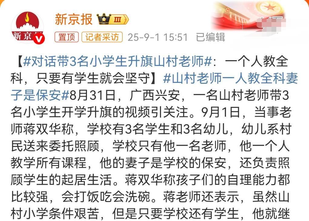这真是让人挺心酸。 一小学只有几个学生了,老师还在坚守。 这是很多微型学校的一个缩影。 9月1日在网上看到这么个消息。 山村老师一人教全科,妻子是保安建后勤。 这老师虽然教几个人,但教所有的学科那也是挺辛苦的。 老师说的一番话也是让人感动,说只要有一个学生需要他,他就会教下去。 #山村老师一人教全科妻子是保安#