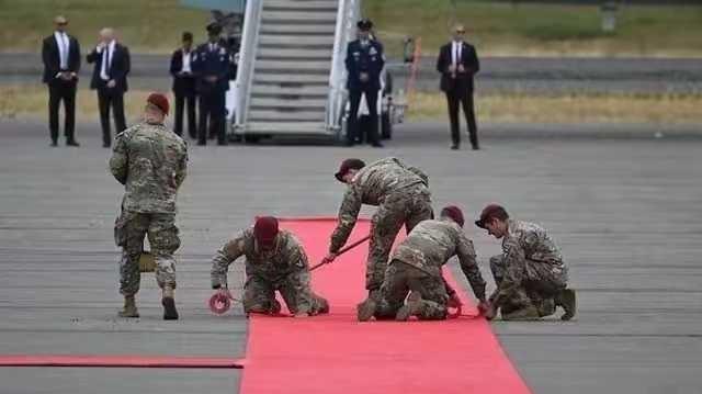 俄罗斯人精准地捕捉到我们在机场铺红地毯的镜头。图1 他们还精准地捕捉到美国人在机场铺红地毯的镜头。图2 竟然还拿来做了对比,不比不知道,一比吓一跳,大家发现了没有? 这个差距不是一般的大啊! 谁落后,谁先进,不多说了,自己看吧! 我只能说,十年河东,十年河西,地毯还是那个地毯,但是变化还是挺大的!
