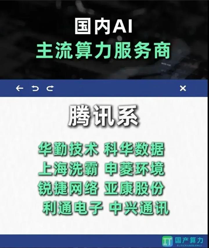 第四为“腾讯系”,涉及华勤技术、科华数据、上海洗霸、申菱环境、锐捷网络、亚康股份、利通电子、中兴通讯等企业,这些企业与腾讯在AI算力领域有合作关系,也属于国产算力阵营。
