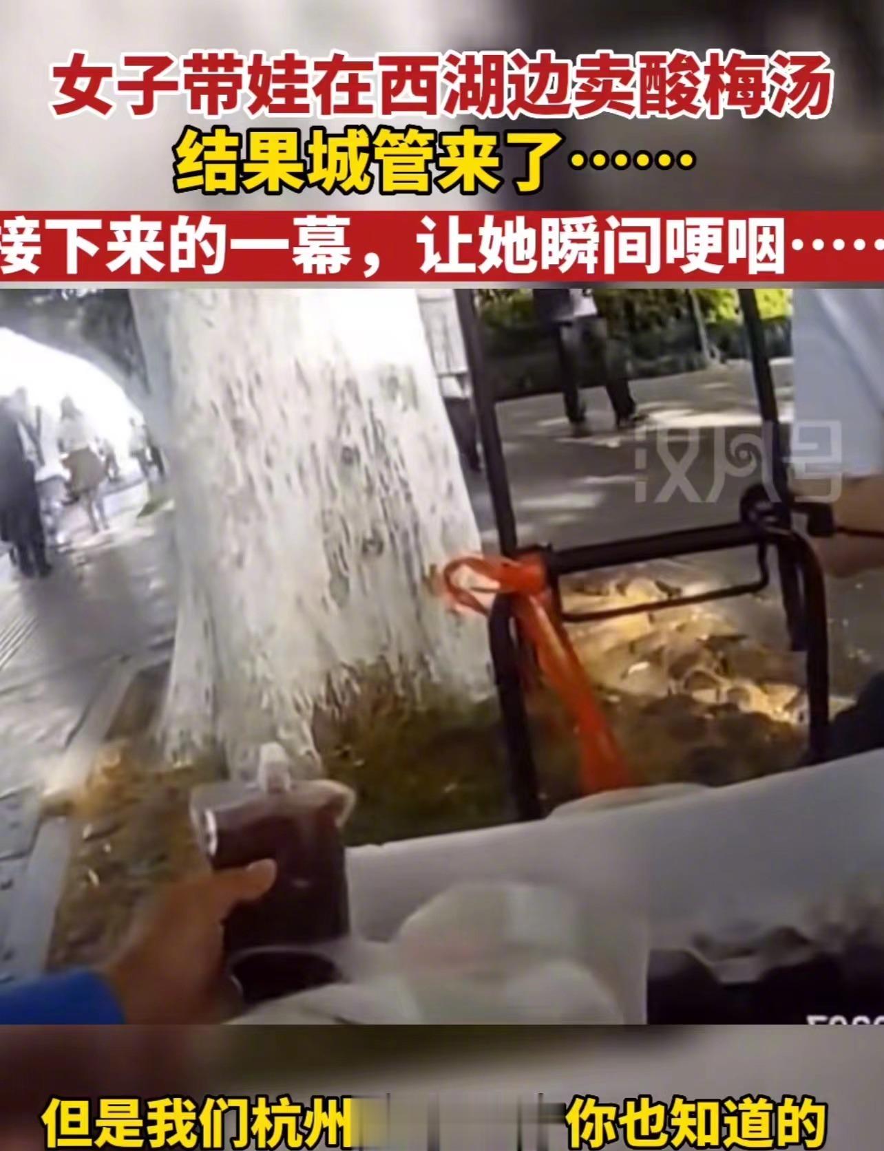 浙江杭州,一名女子在西湖边摆摊卖酸梅汤,突然有城管朝她走来,大声质问女子在卖什么?女子很害怕,以为城管要没收自己的东西,连忙解释说:“我老公患了肾病,没钱看病,我只是想赚点钱养家……”而接下来城管的做法,让女子哭得一塌糊涂!