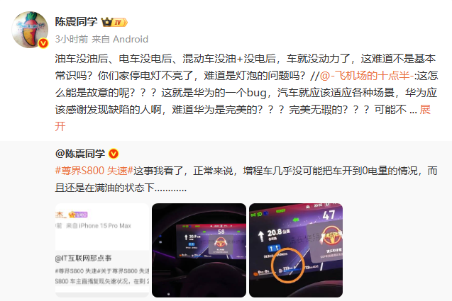 陈震谈尊界S800 失速: “正常来说,增程车几乎没可能把车开到0电量的情况,而且还是在满油的状态下……”