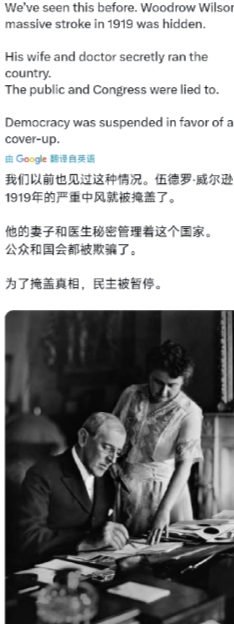 美国媒体人表示:“特朗普自8月26日以来就没有真正公开露面过。只有几张模糊的旧高尔夫照片,仅此而已。没有采访。没有会议。没有治理。白宫一片寂静。如果这听起来像是在掩盖真相,那是因为它看起来确实如此。” 历史上也有类似情况,“德罗·威尔逊1919年的严重中风就被掩盖了。他的妻子和医生秘密管理着这个国家。公众和国会都被欺骗了。为了掩盖真相,民主被暂停。”