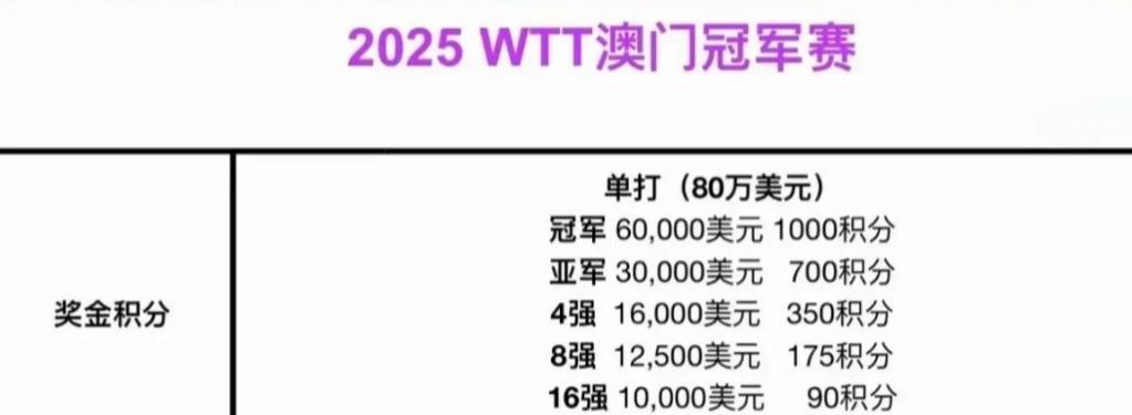 WTT澳门冠军赛即将在9日开战,6天时间决出男女单打两项冠军,总奖金为80万美元