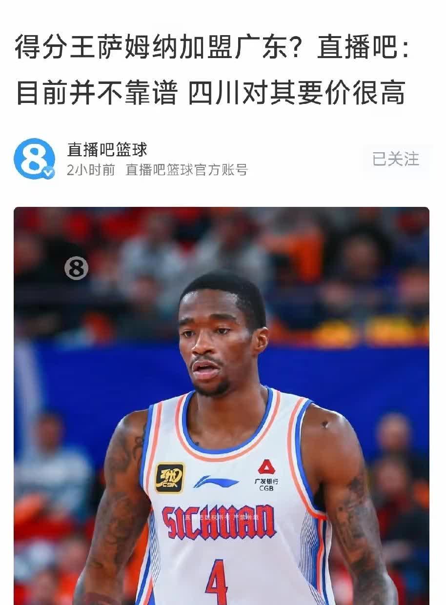 四川借广东过桥哄抬物价可耻 萨纳姆自己官宣加盟广东,随后删除相关信息。 为什么?因为四川明摆着就是让更多的金主来争。 首先萨纳姆个人得分能力已经得到证明,在四川这支鱼腩部队打出天神数据,四川上下一心为其刷数据,关键他也真能刷。 为什么四川会选择广东作为垫背宣传?因为通过交易后广东一跃成为联盟里最恐怖的球队,其国手多达7人,这不得让其他球队担心,如果再加入一个得分机器,自己怎么和广东玩?那就让你得不到萨纳姆[大笑][大笑][大笑],广东开价多少,我比你多就行,例如上海,北京这两大竞争对手。毕竟这哥俩真的有钱。 所以萨纳姆来广东的概率还高不?除非真没有人来抬价,不然广东已经投入巨大,可能真的无法达到四川想要的数额。