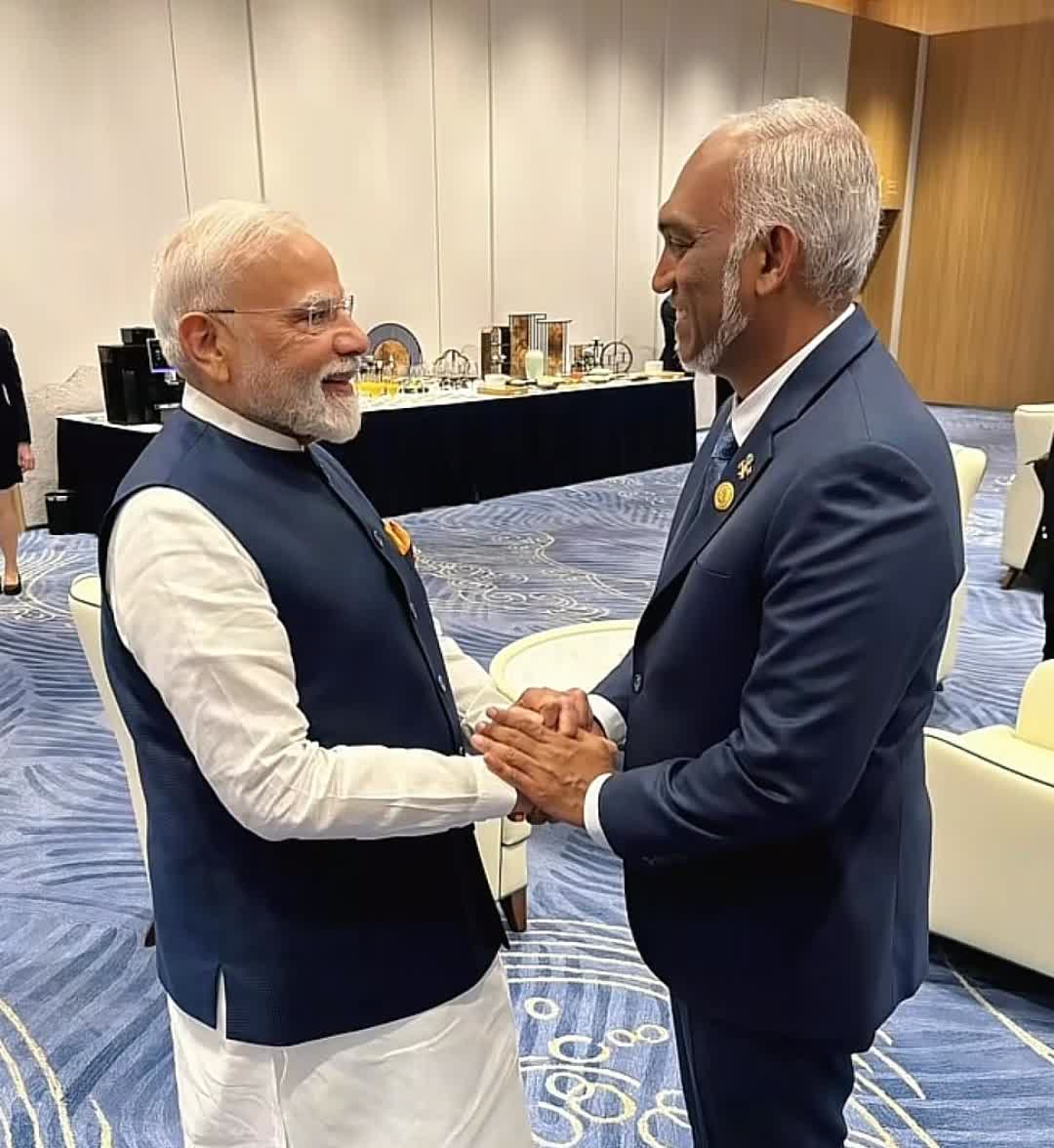 欢迎宴会前,莫迪在休息区与多国元首握手交谈一组照片。 昨天晚上参加宴会穿的衣服