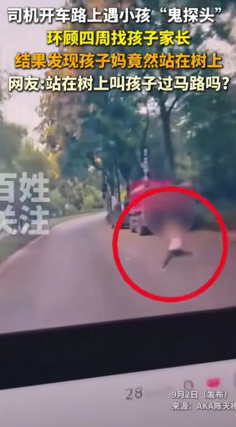 9月1日,重庆。监控画面显示,司机开车路上遇到小孩“鬼探头”,环顾四周寻找孩子家长,结果发现孩子妈妈居然站在树上,不知道孩子家长在树上干什么