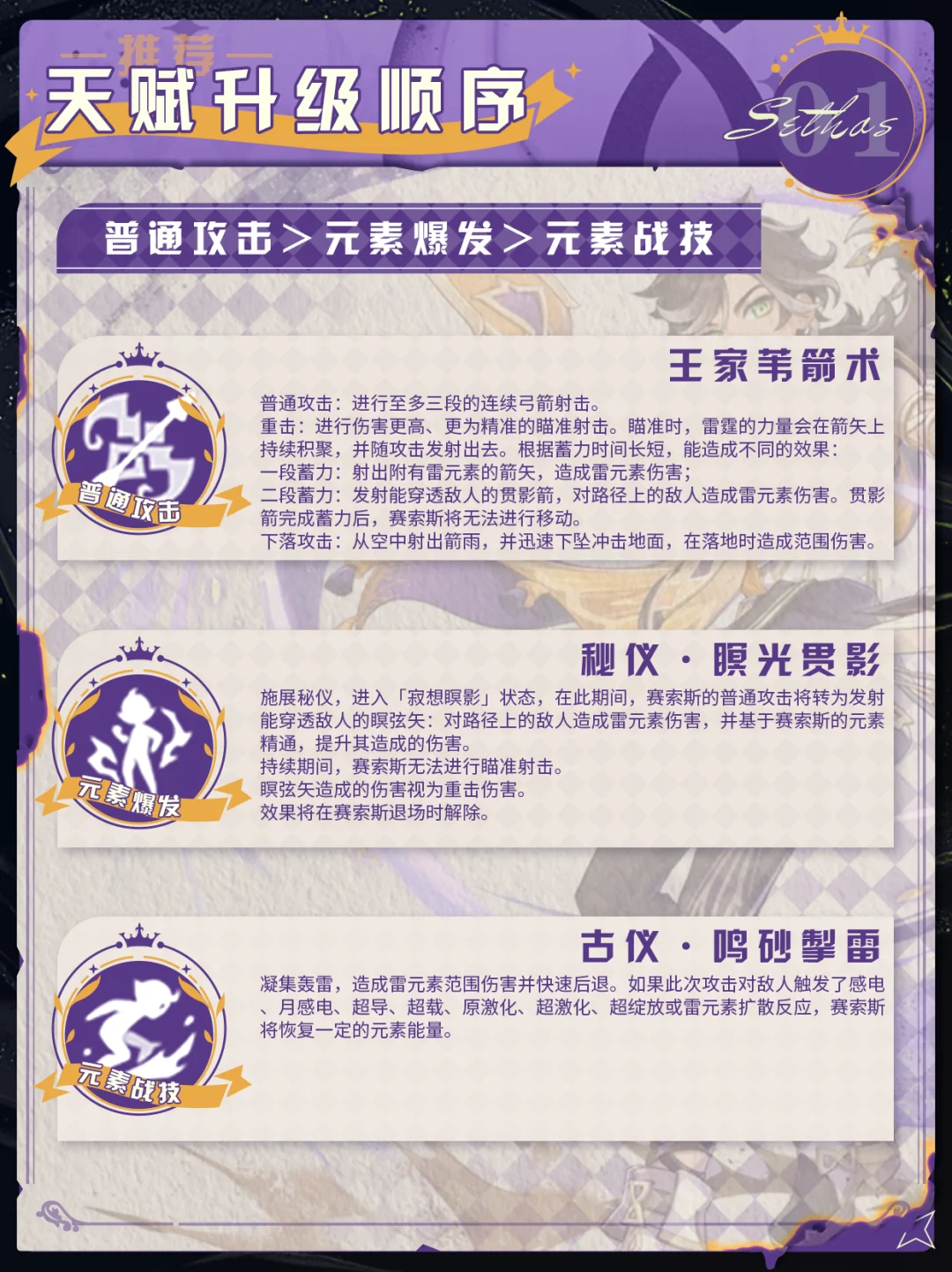 满足以下任意一项条件时,赛索斯的雷元素伤害加成提升15%,持续10秒,至多叠加2层,每层独立计时:通过瞄准射击消耗元素能量,此条件需要解锁固有天赋「黑鸢的密喻」通过古仪·鸣砂掣雷触发元素反应恢复元素能量;施放秘仪·瞑光贯影。