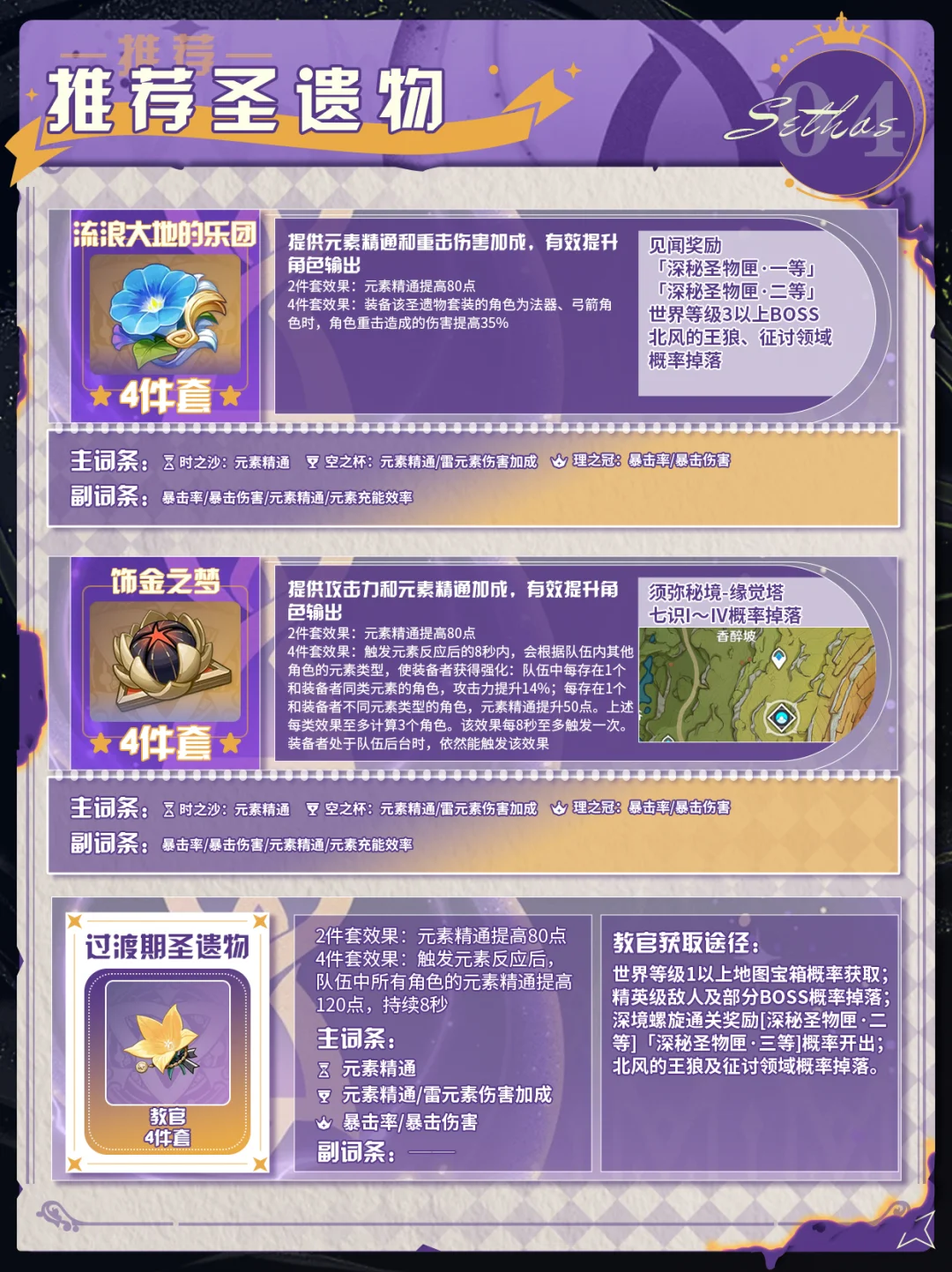 提供元素精通和重击伤害加成,有效提升角色输出2件套效果:元素精通提高80点4件套效果:装备该圣遗物套装的角色为法器、弓箭角色时,角色重击造成的伤害提高35%