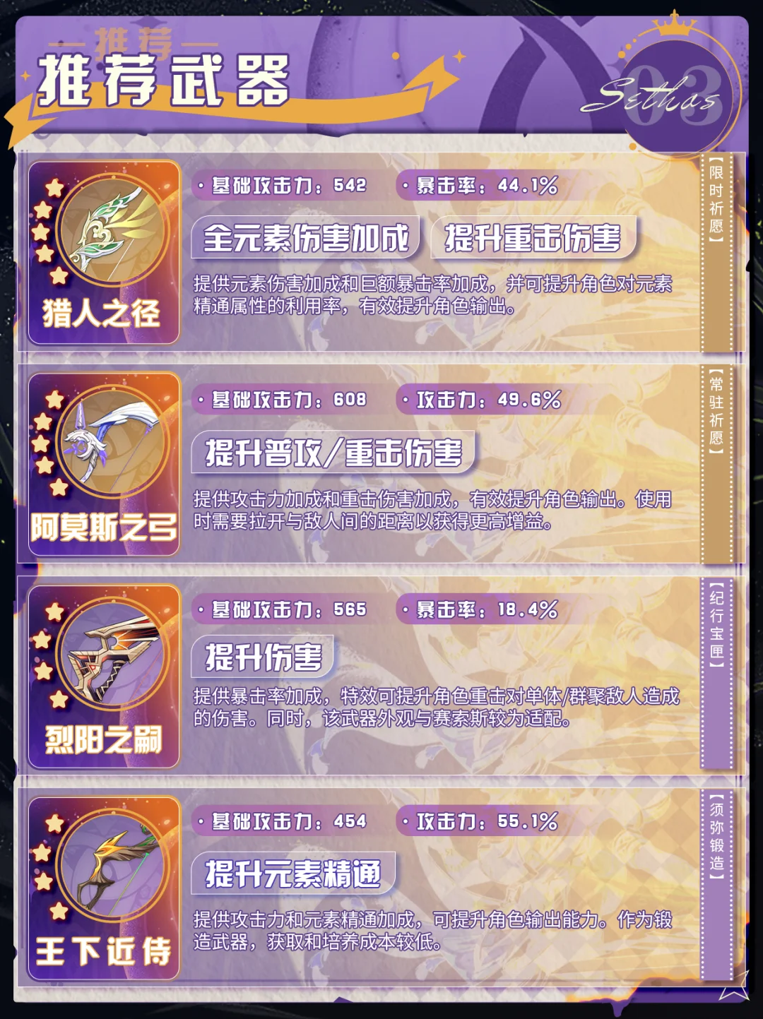 提供暴击率加成,特效可提升角色重击对单体/群聚敌人造成的伤害。同时,该武器外观与赛系斯较为适配。