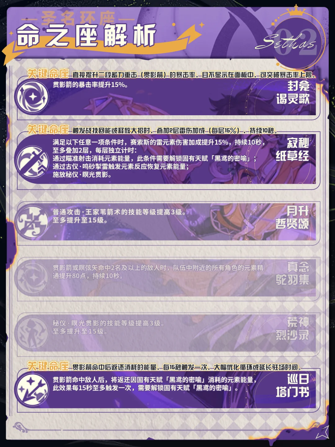 寂秘纸草经 关键命座触发战技回能或释放大招时,看加2层雷伤加成-(每层15%)一,持续10种。