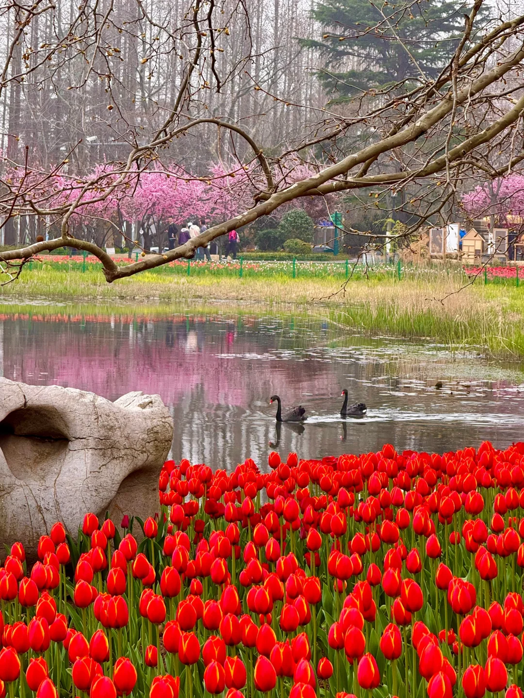 5️⃣小西湖p8-9:盛开的郁金香🌷湖中的黑天鹅 湖的另一畔大片桃花盛开 美晕了