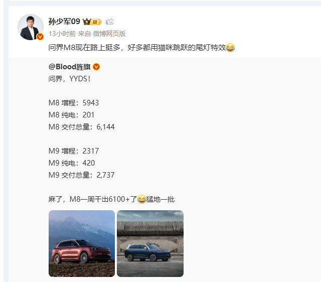 反过来看,M9其实也不错,其中 M9 增程:2317辆 M9 纯电:420 辆 M9 交付总量:2,737辆