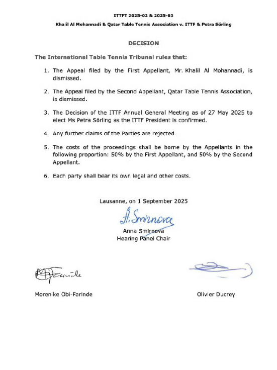 判决主文实质内容如下: • 驳回卡里尔·阿尔·默罕纳迪先生的上诉 • 驳回卡塔尔乒乓球协会的上诉 • 确认2025年5月27日国际乒联代表大会选举佩特拉·索林女士为主席的决定根据国际乒联章程第8.35.3条的规定,“判决主文在通知当事方之时立即生效”。