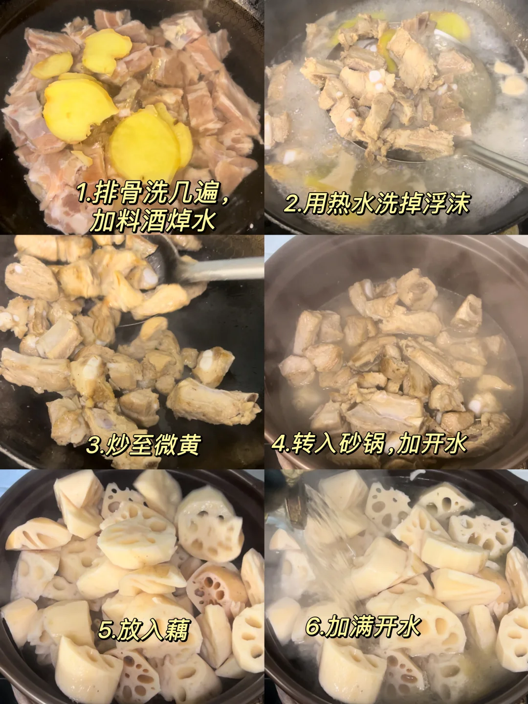 3.排骨清洗几遍,加料酒葱姜焯水三分钟去腥。捞起来用热水洗去浮沫。起锅烧油,炒至微黄,加开水,转入砂锅,再加藕,加满开水。