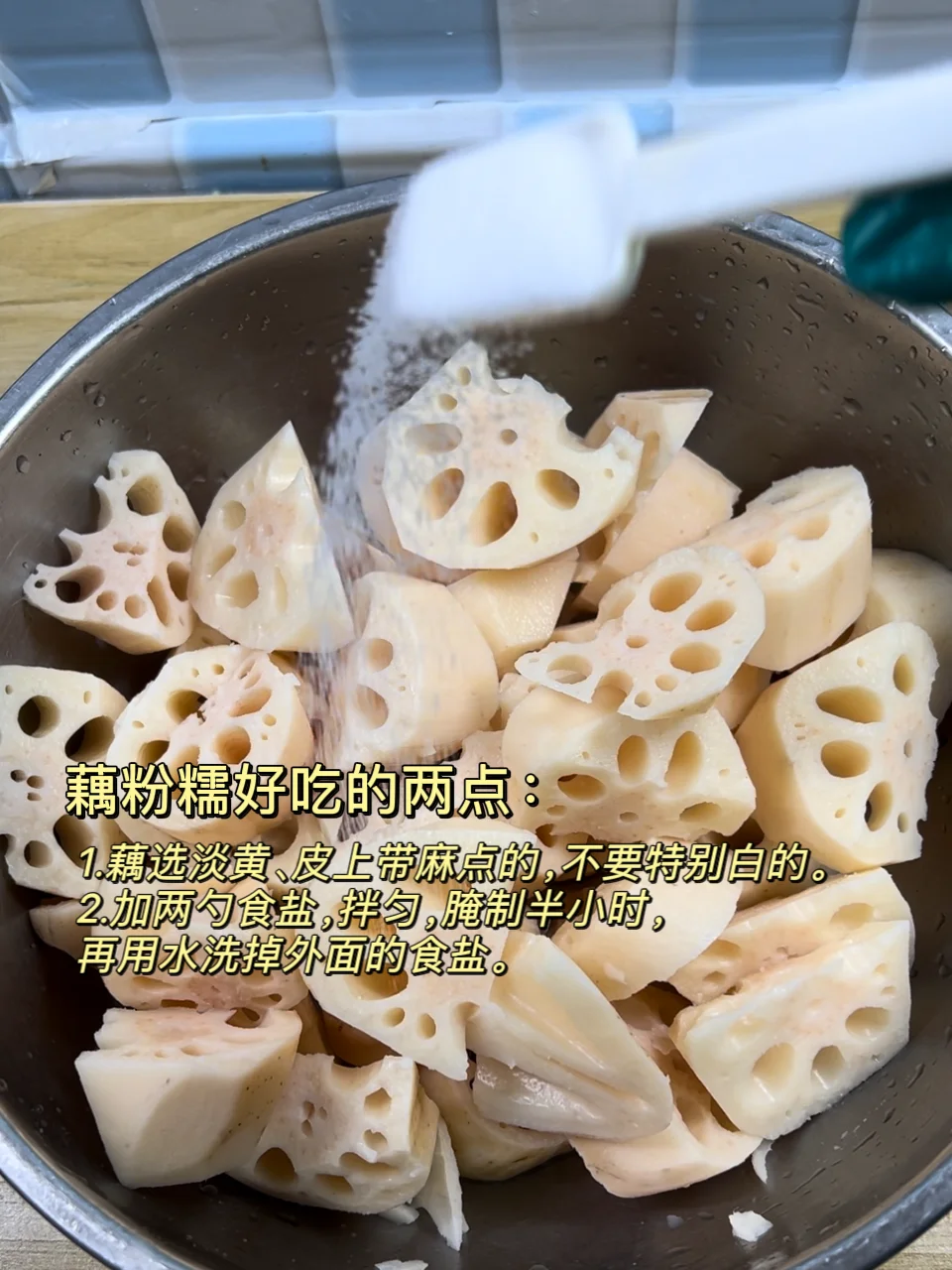 2.藕块要用两勺食盐,拌匀腌制半小时,再洗去表面盐分,这样煮才好吃软烂。