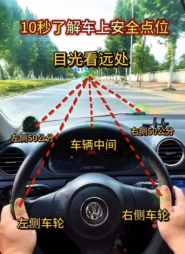 10秒了解车上安全点位。 目光看远处,右侧50公分,左侧50公分,车辆中间直线行驶参照点,学会轻松拿捏。 跟着张教学开车。