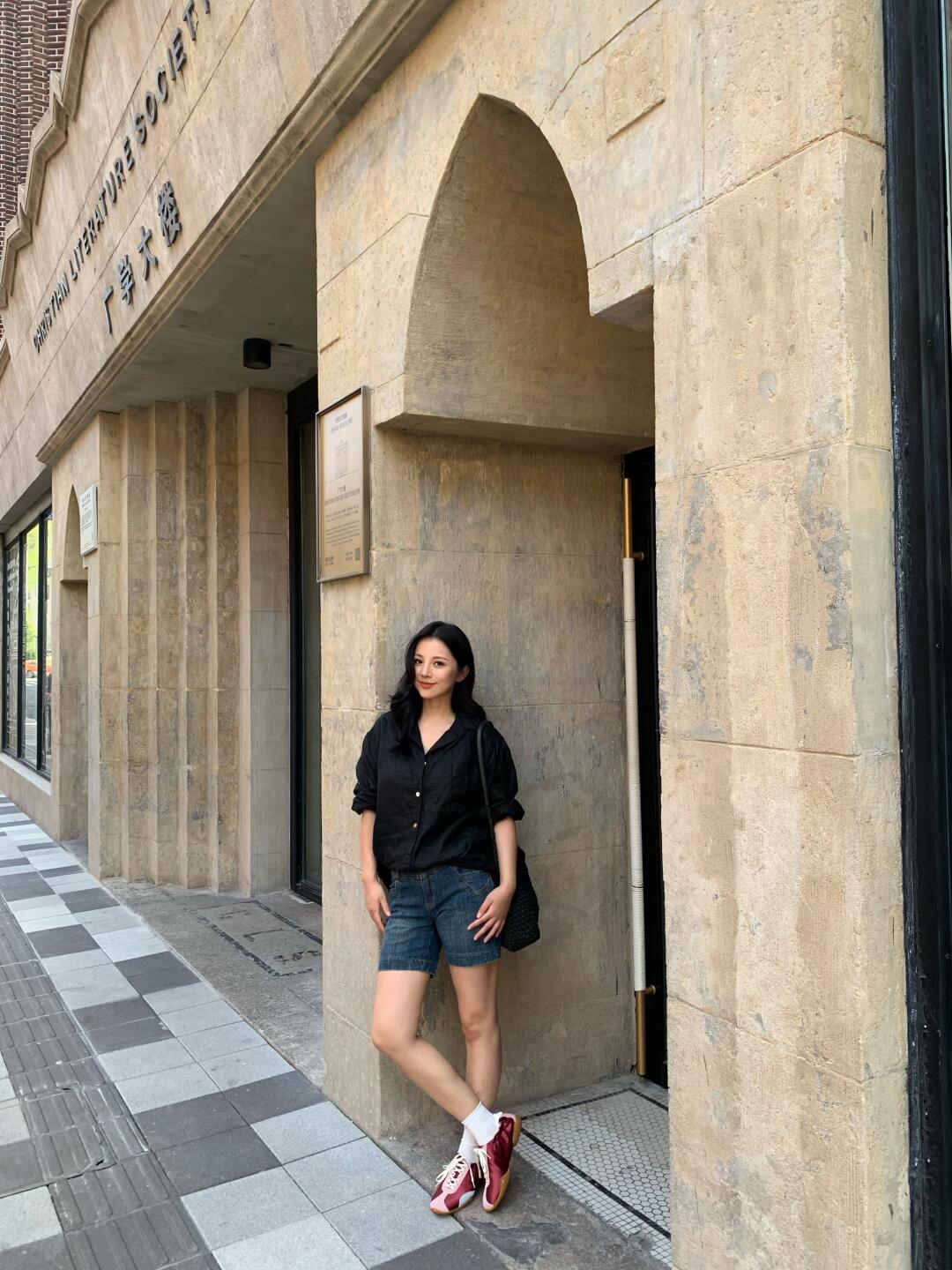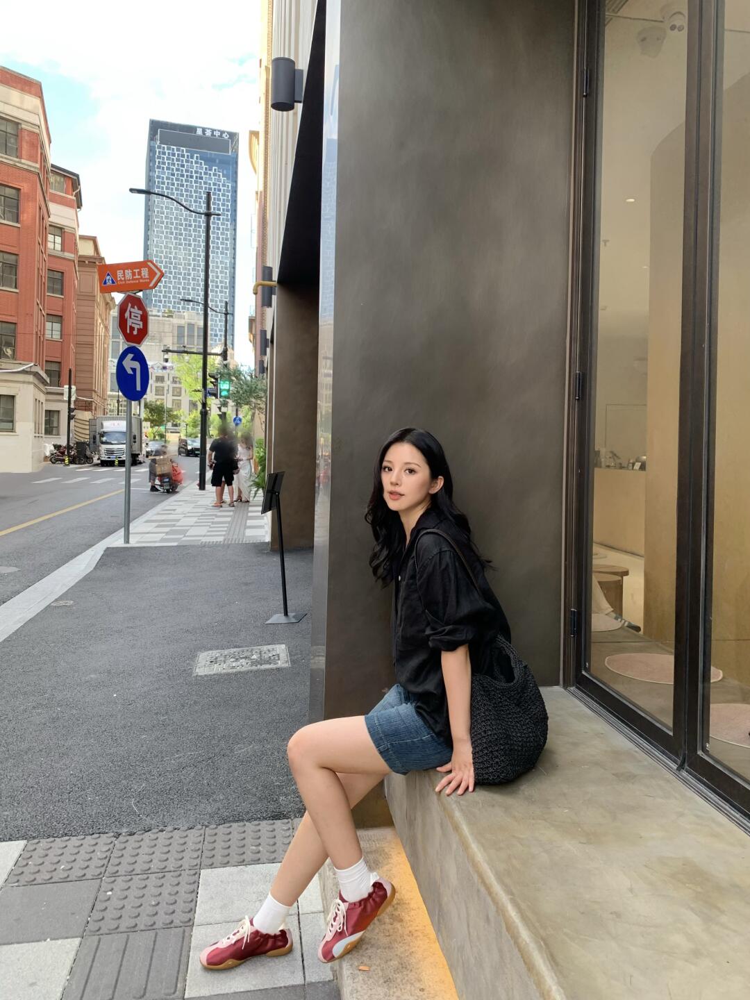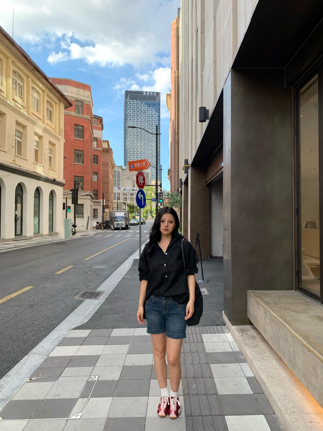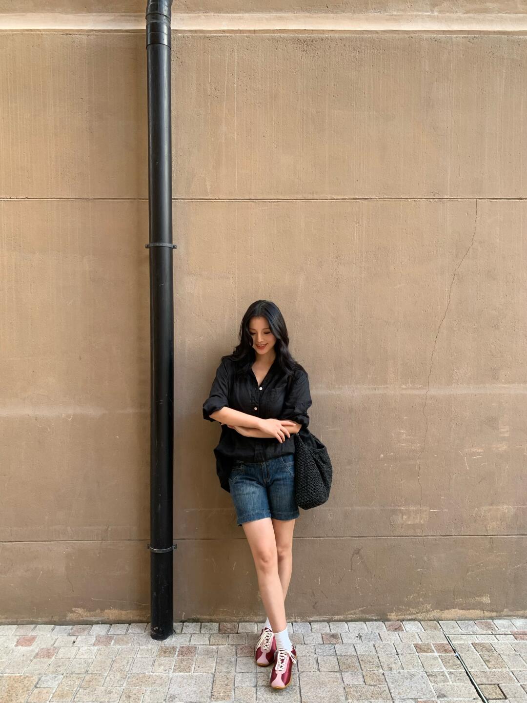 •Look2: 黑衬衫+牛仔中裤。松弛感直接拉满!黑衬衫解开两颗扣子,下摆随意塞进裤子,酒红鞋刚好中和深色系的沉闷,走在梧桐树下随便拍都是美式街头风。