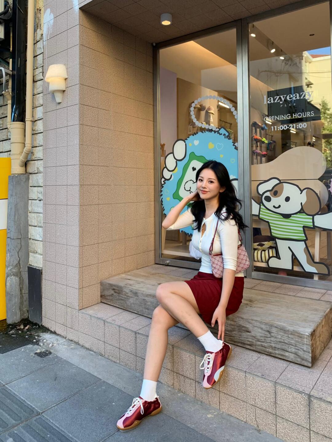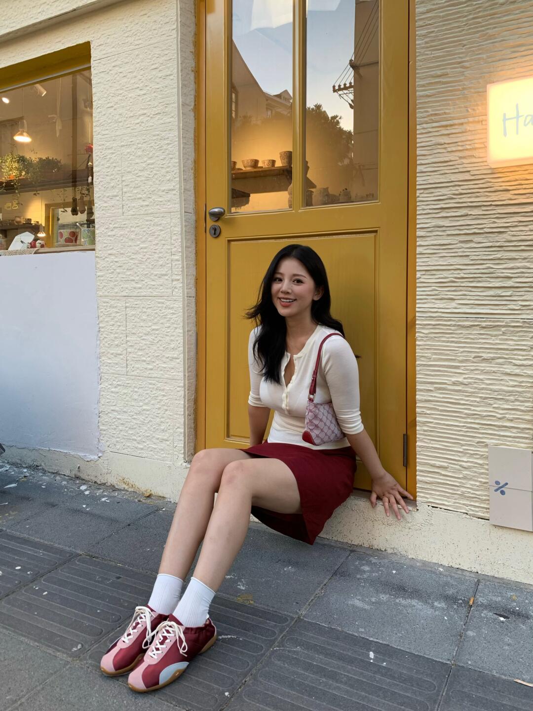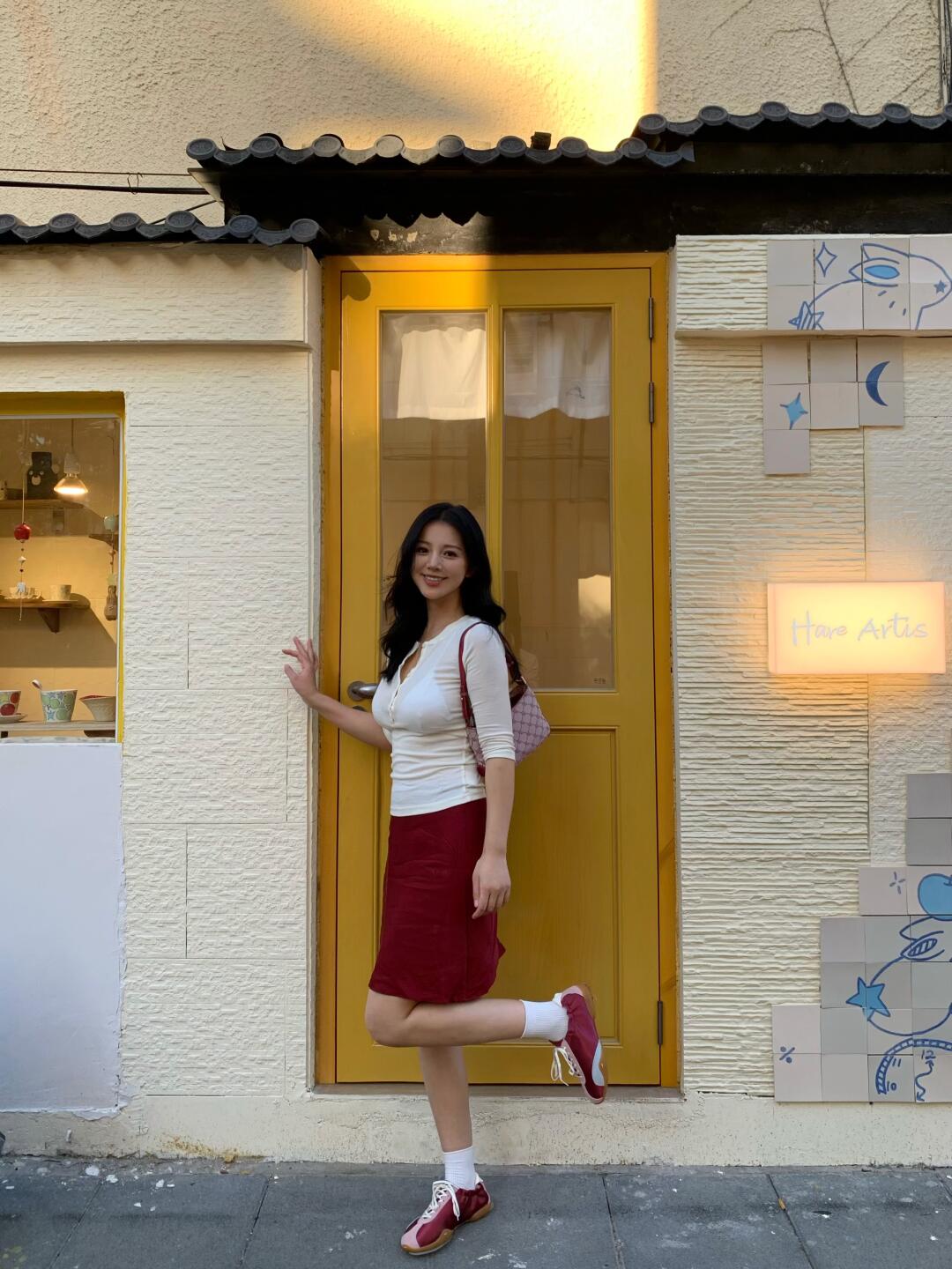 •Look1:简单T恤+酒红短裙。撞色也能这么和谐!明黄色T恤配同色系酒红短裙超有层次感,鞋子和裙子呼应,逛市集、喝咖啡时,阳光洒在鞋面上,连影子都透着温柔。
