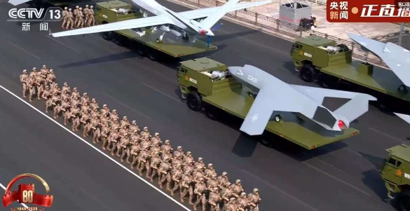 这次阅兵式里亮相的空中无人作战方队真是让我们目瞪口呆,有两款外观神似“六代机”的无人僚机,还有一款飞翼布局的“三角形”无人机,简直不像这个时代的产物。