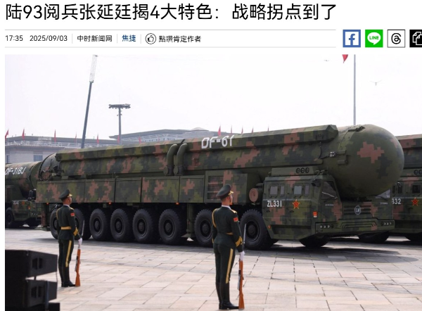其一是,中美博弈,中美军事实力对比的拐点已经到了。事实证明,我们的武器在某些领域相对于美国有了优势,我们已经能够对美国形成极大的反震慑。其二是,解决台湾问题的拐点已经到来了。台海局势已经发展到任何域外势力,以任何方式,都不能阻止我们解决台湾问题的新阶段。其三是,解放军将未来战争形态完整勾勒出来的拐点已经到来。某种程度来说,这一次阅兵式是一次分水岭,我们相信这一次阅兵对于未来国际局势可能也将产生极大的影响。