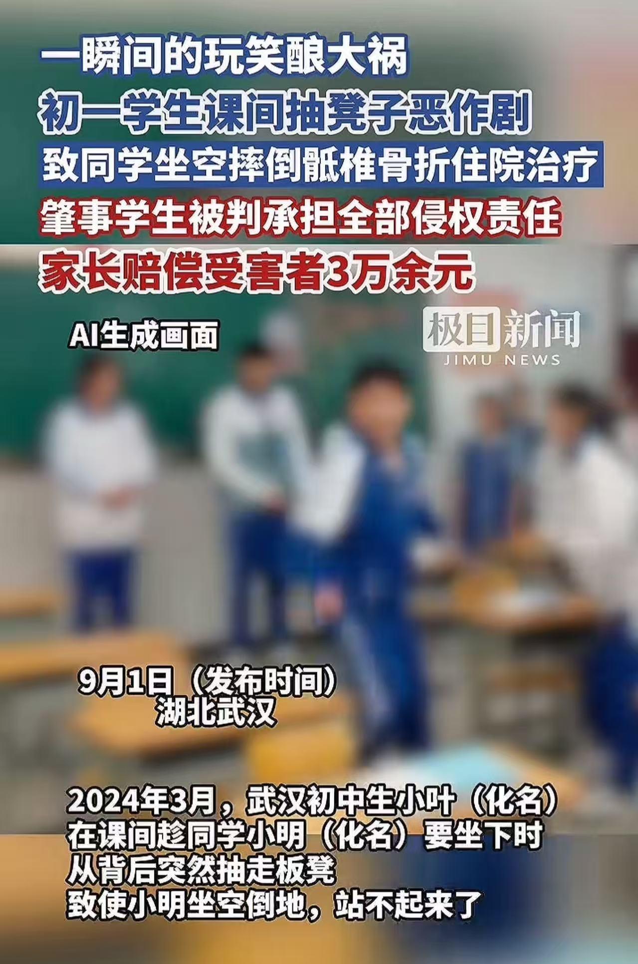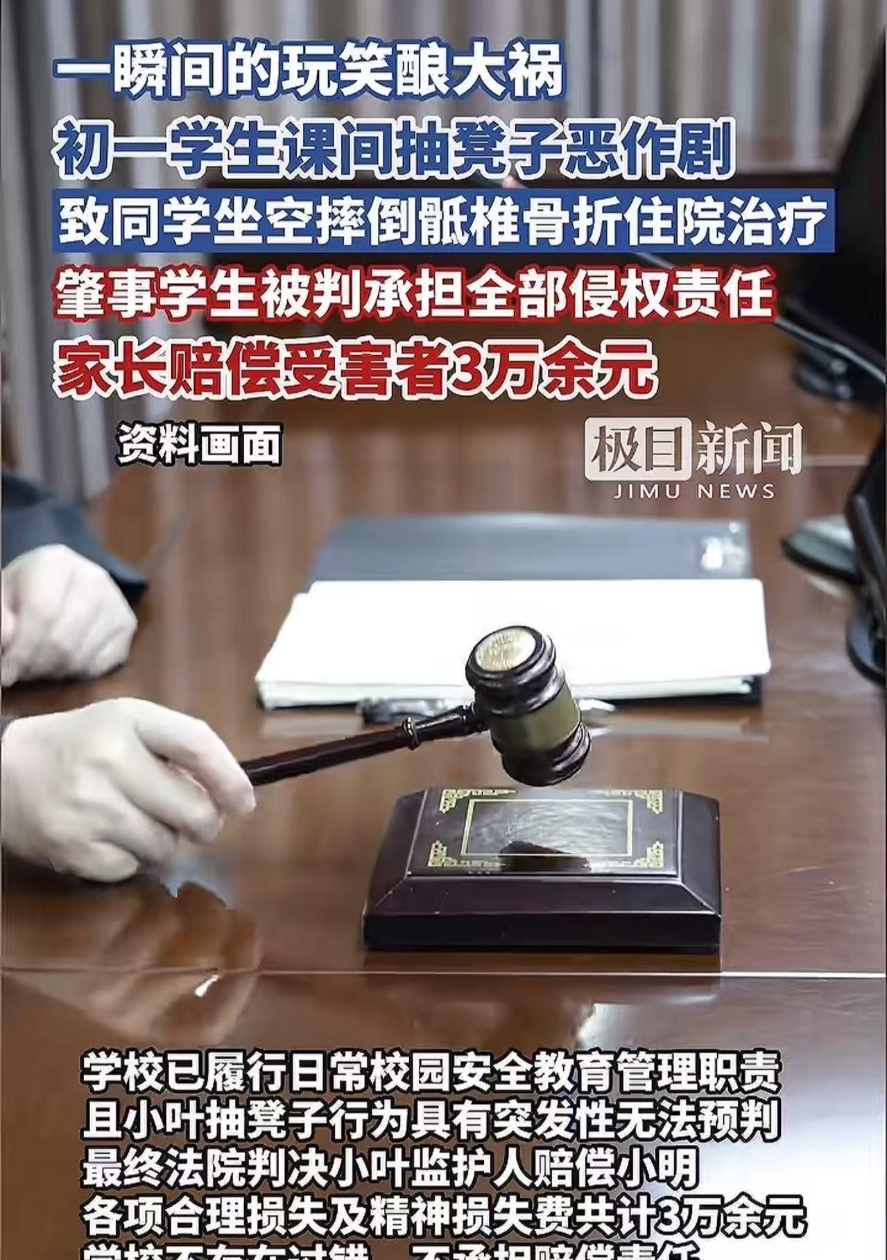 “一个玩笑赔3万!!!”湖北武汉,初一女学生想要作弄男同学,在对方坐下的时候,瞬间抽走椅子,导致对方骶椎骨折,需要住院治疗。男同学父母很气愤,自己孩子不仅受罪,还要被耽误学习,于是他们起诉女生家长,要求赔偿5万,学校也应该负连带责任! (来源:极目新闻) 小叶虽然是个女生,但性格十分活泼调皮。这天课间休息,她瞧见小明正准备在教室的座位上坐下,一个“作弄人”的念头突然就冒了出来。 在小明正要稳稳坐下的一瞬间,她猛地用力把椅子给拉走了。 这突如其来的变故,让小明完全来不及反应,整个人直直地重重摔在了地上。 “哎哟!”小明疼得发出一声惨叫!而此时,小叶和其他几个同学却在一旁笑得前仰后合,他们觉得这场景实在太有趣了。 然而,小明的状况却不容乐观。他疼得脸色苍白如纸,人也站不起来!大家这才意识到问题的严重性,急忙跑去把老师喊了过来。 老师匆匆赶到后,看到小明痛苦的模样,赶忙询问事情的经过。了解情况后,老师不敢有丝毫耽搁,立刻带着小明前往医院进行检查。 经过一系列详细的检查,小明被诊断为骶椎骨折,需要住院进行康复治疗。 老师第一时间通知了小明的家长。同时,考虑到事情的起因,也把小叶的父母喊了过来,希望双方家长能够友好协商医药费用的问题。 小明的父母赶到医院,看到躺在病床上痛苦不堪的儿子,又心疼又气愤。孩子不仅要遭受骨折的痛苦,学业也会被耽误,于是提出了5万元的赔偿要求。 另外,小明的父母认为,事情发生在学校,学校没有尽到看管学生的责任,要求学校承担连带责任。 面对这样的要求,小叶的父母却辩称:“孩子只是开个玩笑,并没有恶意,不应该进行赔偿。” 学校方面也觉得十分委屈,他们表示:“又不是学校的设施导致孩子骨折的,是孩子们自己玩闹出现的问题,跟学校没有关系。而且发现孩子受伤后,我们第一时间就把孩子送到了医院,已经尽到了应有的责任。” 那么,法院会如何判决呢? 不过,学校在平时已经尽到了安全教育管理的责任,像这种突发性的恶作剧,确实很难提前预判并阻止。 所以,法院最终判决女孩小叶的父母赔偿3万多块钱,而学校不用承担赔偿责任。 此事引发了热议,有网友说,我儿子也被一个女生抽了凳子,他给那女生踹了几脚,老师还打电话给我们说我儿子打别人,我说打的好,有打伤我会赔医药费。 也有网友说,现在的孩子这么娇气吗?这都骨折?太脆弱了!孩子之间玩闹,动不动就起诉,以后还有人敢跟你家孩子玩耍吗? 此事件给所有人敲响警钟:玩笑若越过安全的边界,便不再是轻松的趣事,而是一场可能毁掉他人生活的灾难。 小叶以为的“小恶作剧”,却让小明承受了骨折的痛苦和学业的耽搁,也让双方家庭陷入纠纷。学校虽无直接过错,但也警示着教育机构需更加强化对学生行为的安全引导,避免悲剧!