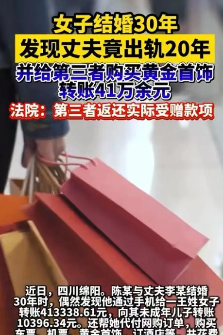 四川绵阳,结婚30年的夫妻,偶然发现丈夫出 轨,妻子追问下才得知,丈夫竟瞒着她出 轨20年,累计给第三者转账40多万,还养育一个未成年的儿子。妻子一怒之下把第三者告上法庭,要求还钱,法院的判决令人非常解气。 四川绵阳的陈阿姨(化名),怎么也没想到,和丈夫老李(化名)过了 30 年,日子看似风平浪静,本以为会这样相伴到老,却在一个平常的下午,被一个手机转账记录,彻底搅乱了! 事发当天,陈阿姨想拿老李的手机查个天气预报,结果手指一划,就看到了一条转给陌生王姓(化名)女子的大额转账记录,金额是 413338.61 元。这还没完,她接着往下翻,发现老李不仅给这王姓女子转了这么多钱,还给对方未成年的儿子转了 10396.34 元! 更让她心凉的是,老李还帮这女子代付网购订单,小到日常用品,大到车票、机票,甚至还买黄金首饰,给她订酒店,前前后后又花了 36446.08 元。陈阿姨拿着手机,手都在抖。 她和老李结婚 30 年,从年轻时候一起打拼,到后来日子慢慢好起来,她一直觉得夫妻感情虽说平淡,但也稳固。可现在,看着这些转账记录和消费凭证,她感觉像被人从背后狠狠打了一棒。 她强压着心头的怒火和震惊,等老李回来,把手机递到他面前。老李一开始还想遮掩,但在陈阿姨一句句的追问下,终于扛不住了,承认自己和这个王姓女子已经交往了 20 年。 20 年啊,几乎是他们婚姻的三分之二时长,陈阿姨只觉得天旋地转,原来自己 30 年的婚姻,有 20 年都活在丈夫的谎言里。 缓过神来的陈阿姨,越想越气。那些钱,是她和老李这么多年一起攒下的夫妻共同财产,老李竟然就这样悄无声息地,给了另一个女人,甚至还帮着养对方的孩子。 她越想越觉得不能就这么算了,于是,她把那个王姓女子告上了法庭,要求对方返还老李赠与的所有款项。 法院审理后认为,老李在婚姻关系存续期间,未经陈阿姨同意,擅自将夫妻共同财产赠与第三者王某,这种行为损害了陈阿姨作为财产共有人的合法权益。而且,老李的赠与行为,也违背了公序良俗。 所以,法院最终判决,老李对王某的赠与无效,王某需要返还实际受赠的款项。 消息传出来后,网友们可炸开了锅。有人说:“这男的也太过分了,结婚 30 年出轨 20 年,把老婆当傻子耍呢?还好法院判得解气!” 还有人感慨:“这女的也挺不容易的,30 年的感情,结果这么不堪,不过好在最后维护了自己的权益。” 也有网友从法律角度说:“夫妻共同财产,一方不能擅自处分,这判决没毛病,就该这样,不然要共同财产有啥用。” 对于陈阿姨来说,这场官司的胜诉,或许不能完全抚平她心中的伤痛,但至少让她在这场婚姻的背叛里,守住了属于自己的财产,也让那个破坏她家庭的第三者,得到了应有的结果。 而这件事,也给不少人提了个醒,婚姻里,忠诚是底线,一旦触碰,不仅感情会破裂,还要承担相应的法律后果。 对此你怎么看?欢迎大家在评论区留言讨论。 信源:纵览新闻 发布于8月29日