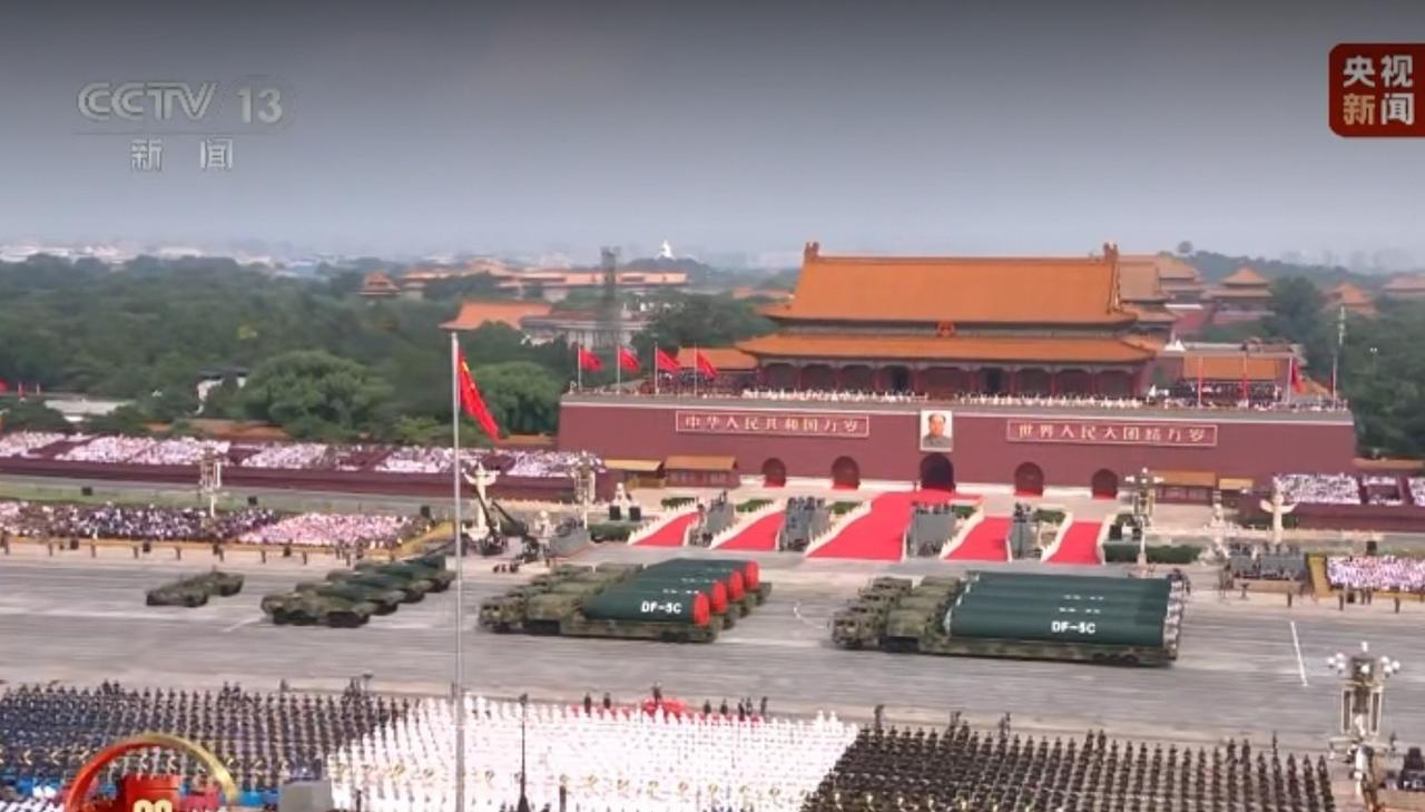 这次阅兵最强的武器恐怕就属这款,DF-5C洲际核导弹,弹头、一级、二级助推器分别装载三辆车才能展示完全,从构型发动机喷尾来看和火箭没什么区别,尺寸是全场武器中最大的,因此需要单独一个方阵展示。央视给它的解说是“能打到全球任意地方”,是当之无愧的国之重器,战略基石。