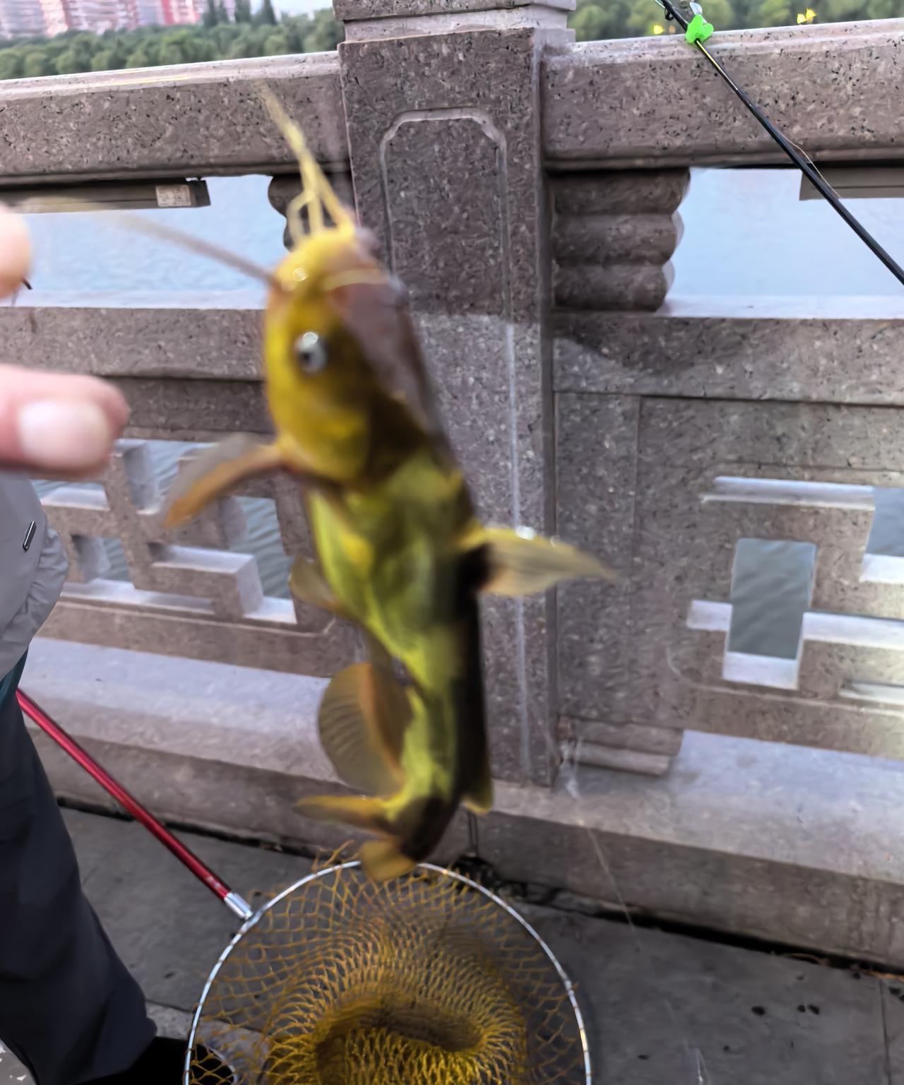 付出有了回报,努力见到成效,倾刻间疲劳消失,幸福唯我知道! 9.4号早5点,天刚亮,垂钓河边东岸小桥头旁边,4.5手竿一把,嗄牙子鱼两尾2+1.0线组,5号钩蚯蚓饵料,水深1.8米,西南风1~2级,晴朗的天空,气温19度,气压1008百帕。 另一把6米手竿,挂玉米粒饵,浮漂纹丝不动。