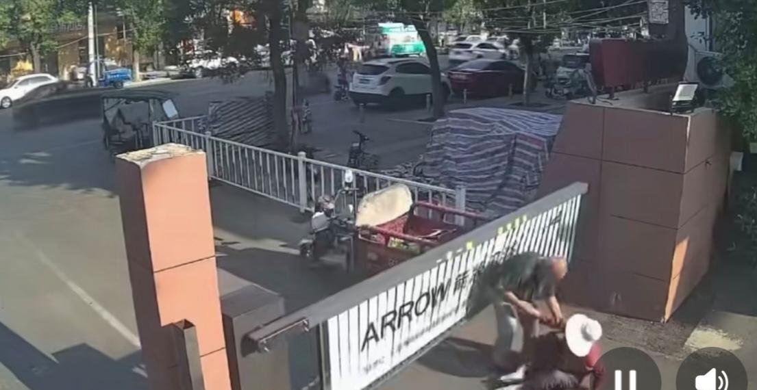一位大爷骑着电动三轮车,车上坐着老伴,大爷准备出小区办事,看前面一辆白色汽车,到小区门口按了一下喇叭,小区的电动闸门就打开了,当白车通过闸门后,大爷看闸门还没有放下,也学着前面白车连着按了几下电动车喇叭,试图让电动闸门不落下,自己好顺利通过。