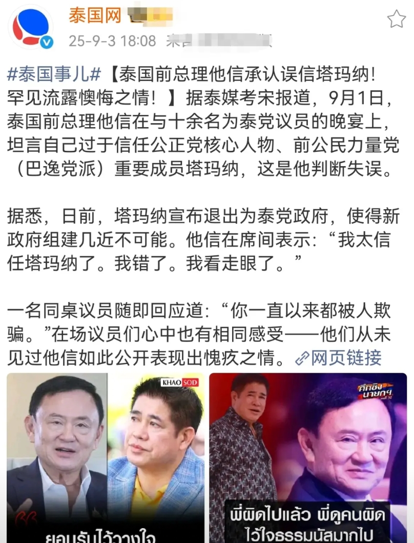 东南亚这些小国哪来的政权可言?就像帮派一样,互相争夺,好似从前的香港九龙。毫无秩序,谁的拳头硬、势力大谁就是老大。不像我们这种大国,有完整的体系。 泰国网消息,日前他信在一场重要的晚宴上表示,他太信任巴逸党的塔玛纳了,说自己看走眼了。暗指,被塔玛纳出卖,才导致他信家族屡次陷入政治洪灾。 显然,泰国政权也就是各家族之间的斗争,不惜用一切江湖手段,以实现斗争目的。这种政体注定走不远,也很难为民众提供一个安全稳定的社会秩序。