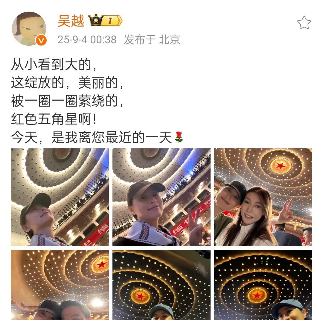 演员吴越演出结束后分享文艺晚会后台合影,发文感叹:珍贵的青年才俊们,珍贵的后台们,再见啦我亲爱的五角星,祝福和平!祝福祖国!