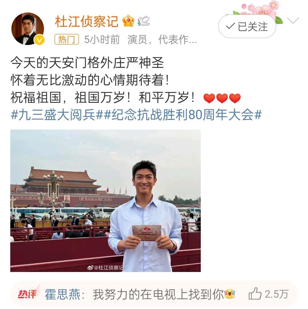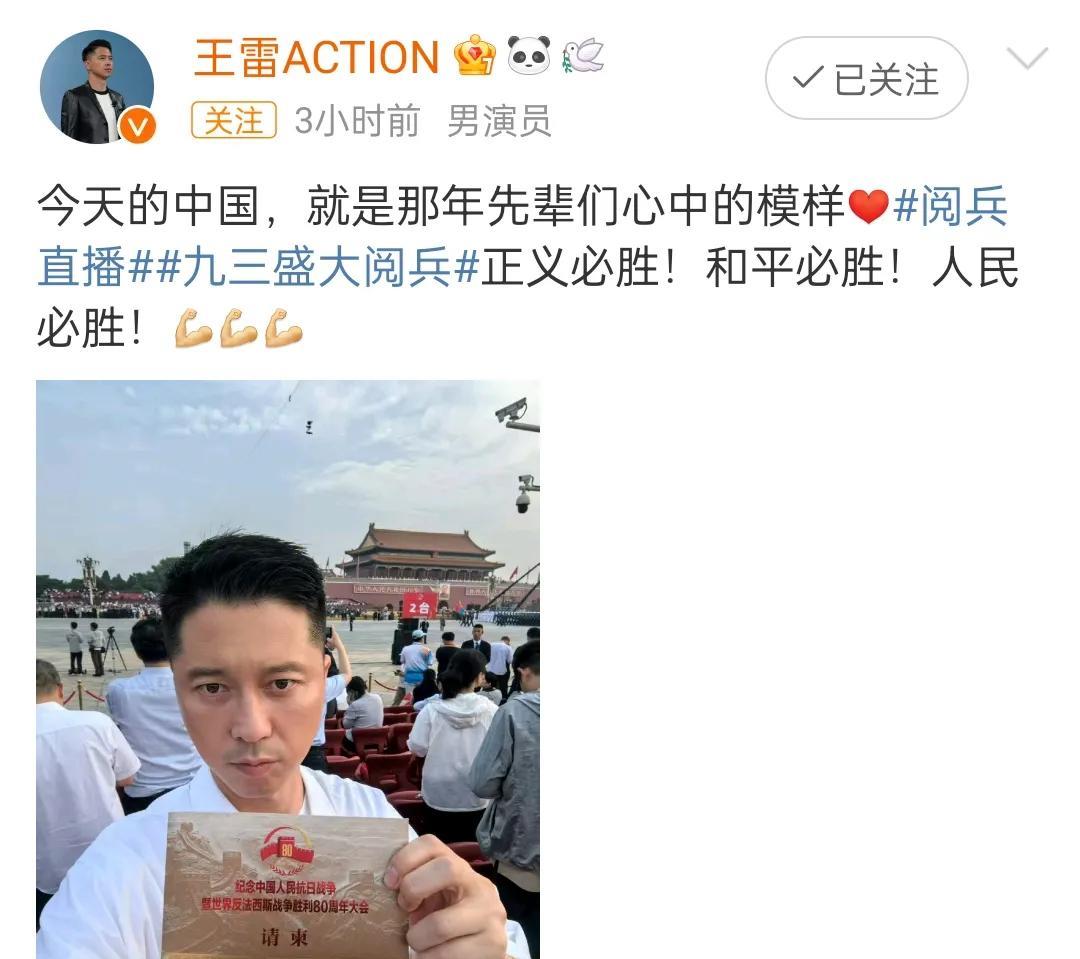 演员王雷现场观礼阅兵式,晒出自己的观礼请柬,激动配文:今天的中国,就是那年先辈们心中的模样!正义必胜!和平必胜!人民必胜! 照片中王雷身穿白色衬衫,手里紧握着请柬,用手机自拍合影,看着照片已经能感受到现场观礼的震撼心情! 很喜欢杜江和王雷在影视作品中饰演的军人形象,两位都是根正苗红的好演员,能在现场观礼也是莫大的荣光!