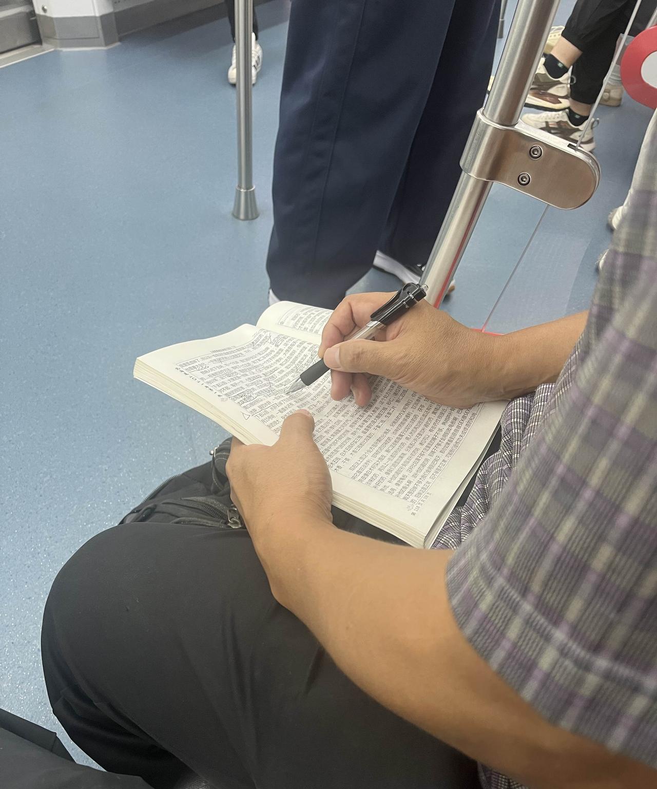 早晨上班路上,在石家庄地铁上遇到的一位勤于阅读和学习的大叔,目测年龄60岁左右。