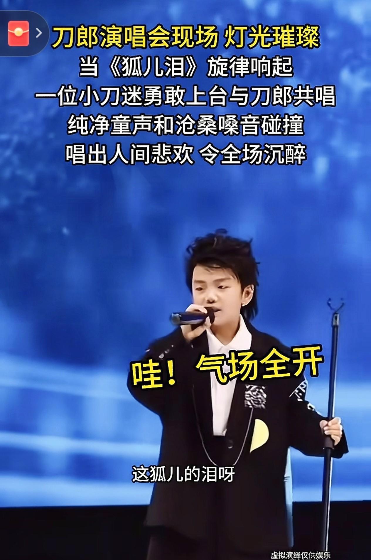 刀郎演唱会暖心时刻:小刀迷同台唱《狐儿泪》 刀郎演唱会现场灯光璀璨,当《狐儿泪》的旋律缓缓流淌,一位小刀迷勇敢站上舞台,与刀郎并肩合唱。 纯净稚嫩的童声,碰撞刀郎满含故事的沧桑嗓音,两种截然不同的声线交织,将歌曲里的人间悲欢娓娓道来。台下观众静静聆听,全场都沉醉在这治愈又动人的氛围中。#明星# #刀郎# #娱乐圈# #娱乐圈每日热议#