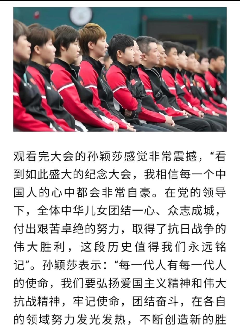 认真观看阅兵式直播的孙颖莎王楚钦 今天国乒大家庭一起观看9.3阅兵式直播,大家统一着装,坐的齐刷刷的,两小只的位置也很显眼,紧挨着领导两边,一眼就认出来,观后两小只都讲了话。 今天的阅兵式很震撼,看得大家热血沸腾的,都为强大的祖国感到骄傲和自豪! 莎莎表示:每一代有每一代的使命,要在各自的领域发光发热,为强国做出自己的贡献。 王楚钦也表示,要把先辈勇于直面挑战困难的精神发扬下去,在以后的训练和比赛中,激励自己。 都是根红苗正的好孩子,能文能武!