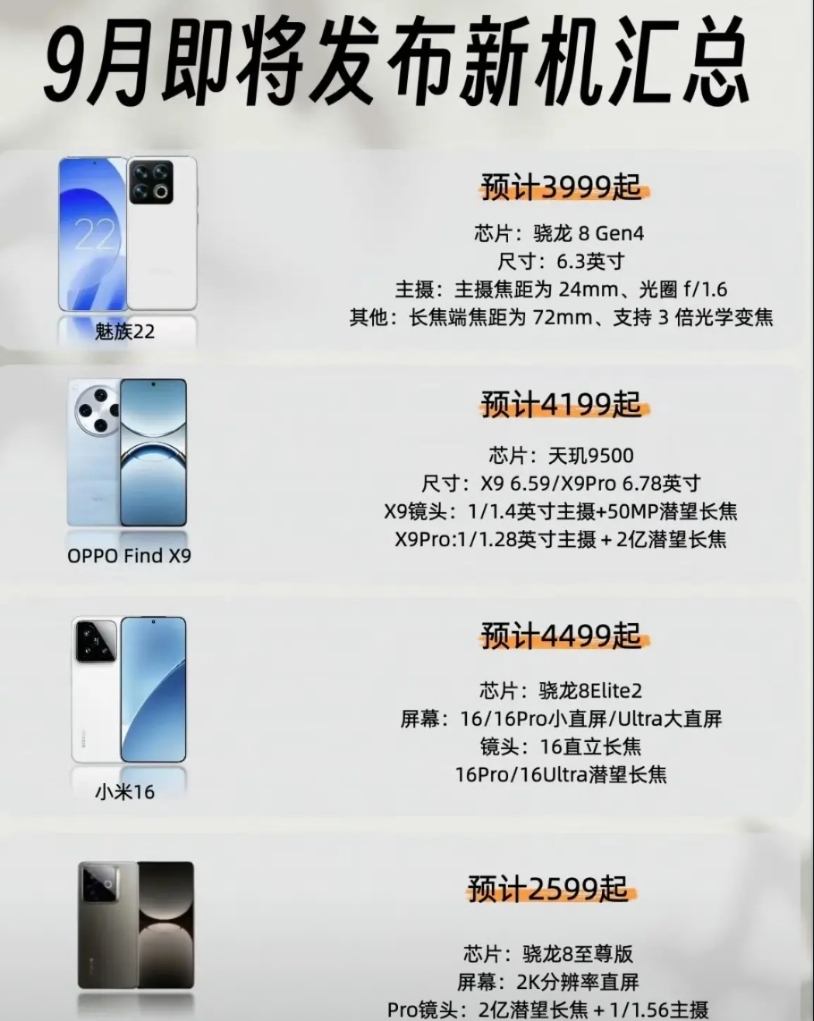 9月即将发布的新机,大家最期待哪一款? iPhone17系列:苹果新旗舰来袭! 华为三折叠:目前最高端的华为手机。 vivo x300系列:新一代影像旗舰。 小米16系列:最水桶的安卓旗舰。 红米K90系列:追求极致性能。