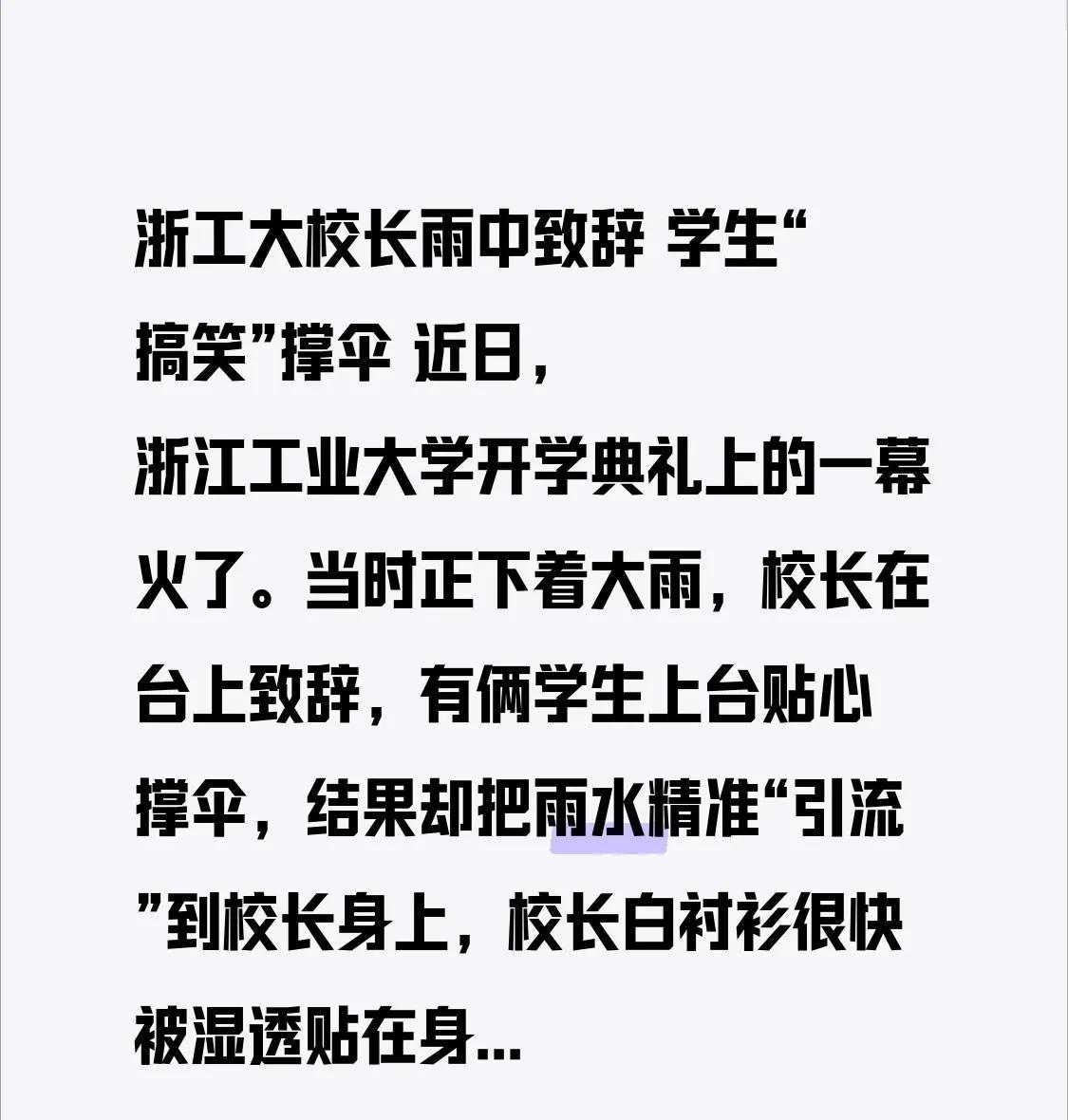 浙工大校长雨中致辞学生“搞笑”撑伞近日,浙江工业大学开学典礼上的一幕意外走红