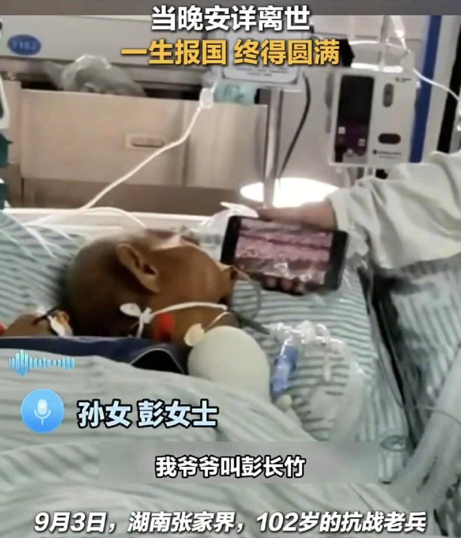 “老人家一路走好!”湖南张家界,102岁的抗战老兵彭长竹在重症监护室里安详闭上了眼睛,几小时前,这位双目几乎失明的老人坚持用手机看完了九三大阅兵,对他来说,这一刻或许是一种圆满 据悉,彭长竹年轻时参加过常德会战,那一年是1939年。他和战友们在战场上连续鏖战三天三夜,拼到最后靠近肉搏。右眼在那场战斗里被刺瞎,可他一直说,能赢下那场仗,就值了。那一代人身上带着的,是伤口,也是信念 九十多年过去,老人已经是暮年中的暮年了。家属很清楚,他对这些大事格外上心,所以哪怕是在病床上,也让他看了一眼这次的阅兵 说实话,看到这样的事情,总是让人鼻子一酸,感慨万千。生死本身是自然规律,但能在生命最后的时刻,带着一种“见证过”的满足感离开,其实是幸运的 很多老兵这一生经历过的,年轻人很难真正体会,但从他们的离世中,能感受到一种沉甸甸的传承 很多人说,老人坚持到看完阅兵,是为了最后看一眼他曾经用生命保卫的祖国如今多么强大。他不是简单地“离世”,而是归队向战友们汇报 #102岁老兵ICU看完阅兵后安详离世#