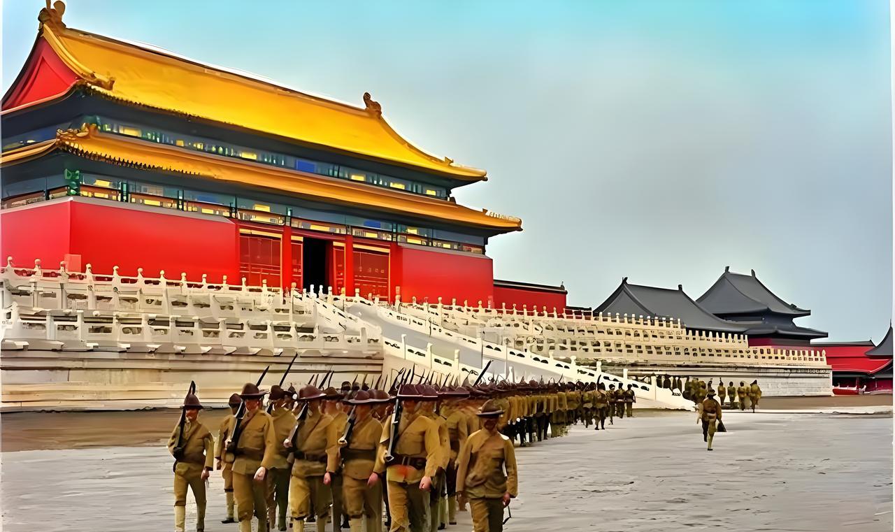 这是1900年的8月28日,京城被侵略者分区占领后,各区域的中国人家必须悬挂占领国国旗,一时间,晚晴帝都插满了八个国家的国旗。为了炫耀武力,八国联军在紫禁城进行了一场阅兵式。在金水桥前吹奏各国的国歌。侵略者们还嫌不够,在光绪帝的龙椅前,在慈禧的凤床上,各种肆无忌惮的摆拍炫耀。此刻,慈禧太后携光绪皇帝弃全城百姓不顾,正仓皇西逃。令人不解的是,在阅兵队伍中,甚至出现了由中国人组成的华勇营。他们作为英国的雇佣军,背叛了自己的国家,跟在外国侵略者的身后。八国联军在紫禁城阅兵,是中国近代史上的一道深刻伤痕,它时刻提醒着我们,只有国家强大,才能避免重蹈覆辙,才能捍卫国家的尊严和人民的幸福。