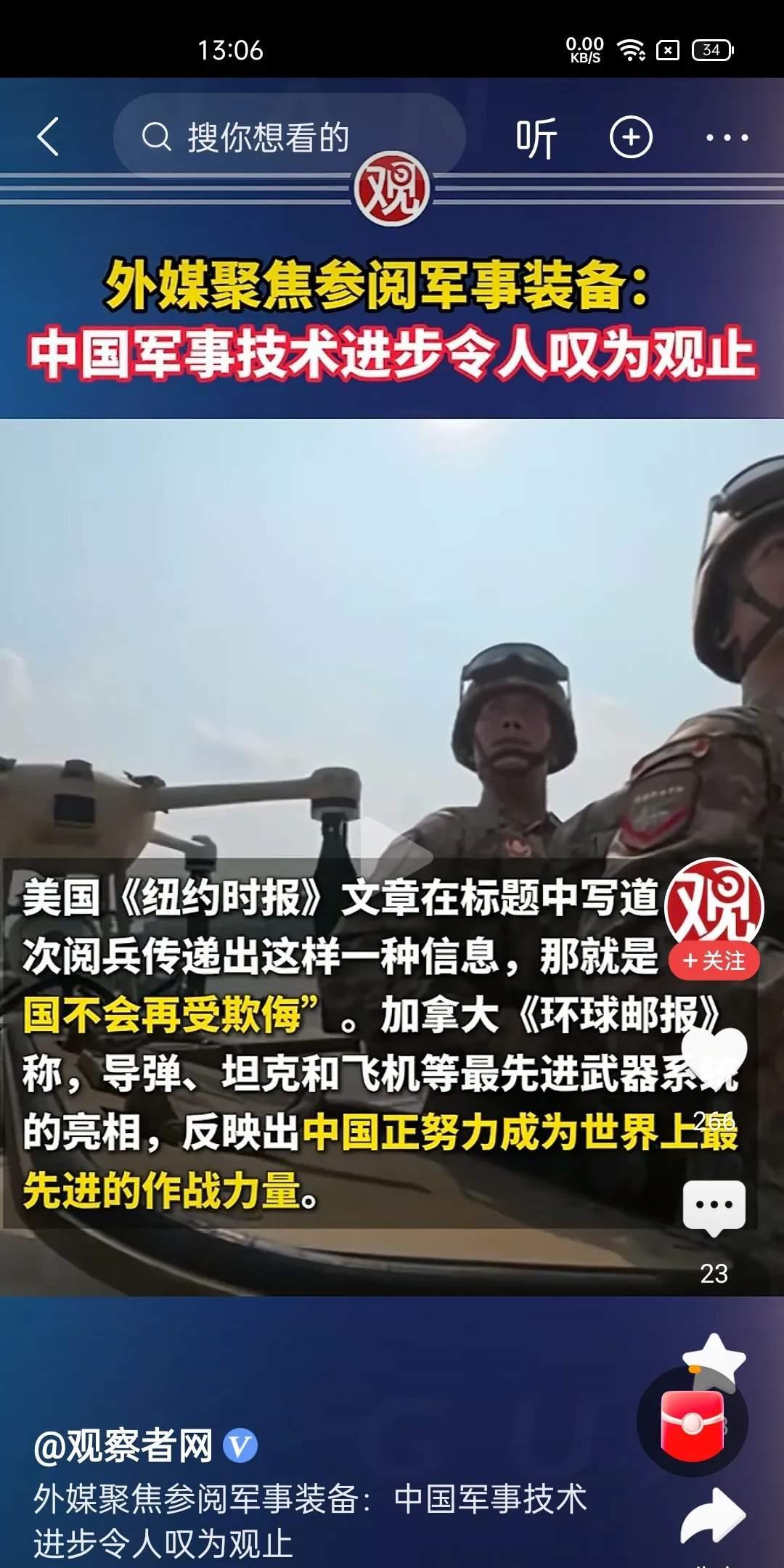 以前的大阅兵,向人民汇报军事发展成就的是一方面,也有对外震慑的含义。不过以前在武器装备上并没有跟强国拉开距离,震慑的效果有限。这次阅兵不一样,批量展现的先进武器把西方震了,在报道上的画风也集体转变了。 英国BBC称,新型军事装备让西方震惊,美国国防部和全球官员可能正在忙于研究这些装备。 美国CNN称,中国LY-1激光器令人印象深刻,成本更加经济,可能比子弹或者炮弹还低。 法国法新社称,中国空警600预警机亮相,展示了中国雷达探测能力。加拿大媒体称,导弹,坦克,和先进飞机的亮相,反映出来中国正在努力成为世界上最先进的作战力量。 美国纽约时报看了阅兵后表示,这次阅兵传递出一个信息,"中国不会再受欺辱"。 我们实现了从追赶到超越,确实让西方老牌列强们很不适应。