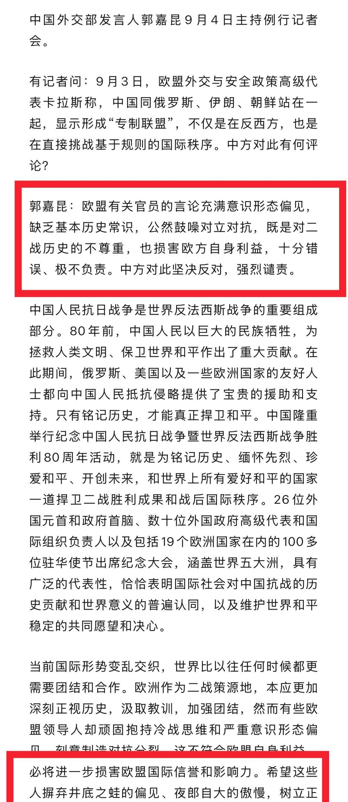欧盟污蔑中国阅兵“挑战国际体系”,还说中俄没参加二战,外交部用三个词定性 中国用9.3阅兵式纪念反法西斯战争胜利,欧盟不愿意派官员出席仪式也就罢了,其外交负责人卡娅·卡拉斯竟然还口出狂言。 她先是声称,中俄朝伊领导人共同出席9.3阅兵式,是在联合起来挑战所谓“基于规则的国际秩序”。之后,俄媒还放出了一段她的采访。在采访中,她竟然质疑中俄为二战付出巨大胜利并最终赢得二战的真正历史,原话是:“俄罗斯转向中国说:‘我们参加了二战,赢得了二战,打败了纳粹主义’,我当时想‘这倒是新鲜事’。如果你了解历史,就会有很多疑问,但如今人们读书不多,也不记得历史,就会中俄的相信这些说法。” 这样的说法显然荒谬至极,也显示出卡拉斯自己对历史一无所知。而欧盟能让这样不学无术的人稳坐关键岗位,似乎也预示着欧盟已经这个组织也快要完蛋了。连欧洲网民也嘲讽称,中俄朝伊聚在一起共襄盛举,谁会在乎爱沙尼亚人(卡拉斯是爱沙尼亚前总理的女儿)说了什么?过两天,她会不会说奥斯维辛集中营是以德百年团结友好的象征? 而对于卡拉斯的言论,4日的中国外交部记者会上,发言人郭嘉昆也进行了强烈谴责,并用“充满意识形态偏见”,“缺乏基本历史常识”,“公然鼓噪对立对抗”三个词进行了定性。 显然,稍微有点常识的人都知道,我们纪念反法西斯战争胜利,恰恰是在捍卫二战后世界秩序。而如果欧盟将这样的举动定义为挑战秩序,那我们就要问问了:按照逻辑,如果欧盟执意站在“反法西斯”的对立面,那他们坚持的,到底是什么?