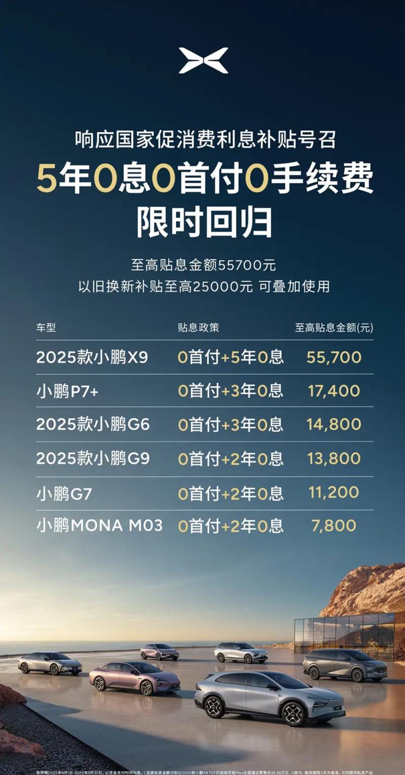 小鹏 9 月放大招!5 年 0 息 0 首付 0 手续费金融政策限时回归,错过等一年 [惊喜] 金融给力:2025 款小鹏 X9 享 5 年 0 息 0 首付,至高贴息 55700 元;小鹏 P7+ 3 年 0 息 0 首付,贴息 17400 元;2025 款小鹏 G6、G9、G7 及小鹏 MONA M03 也都有对应 0 息 0 首付政策,贴息从 7800 元到 14800 元不等 新增福利:新增低息低日供政策,购车至高额外补贴 6000 积分 以旧换新:以旧换新补贴至高 25000 元,还能和金融政策叠加使用,综合优惠超 8 万 这波小鹏诚意满满,想入手的鹏友们抓紧 9 月冲一波![机智]