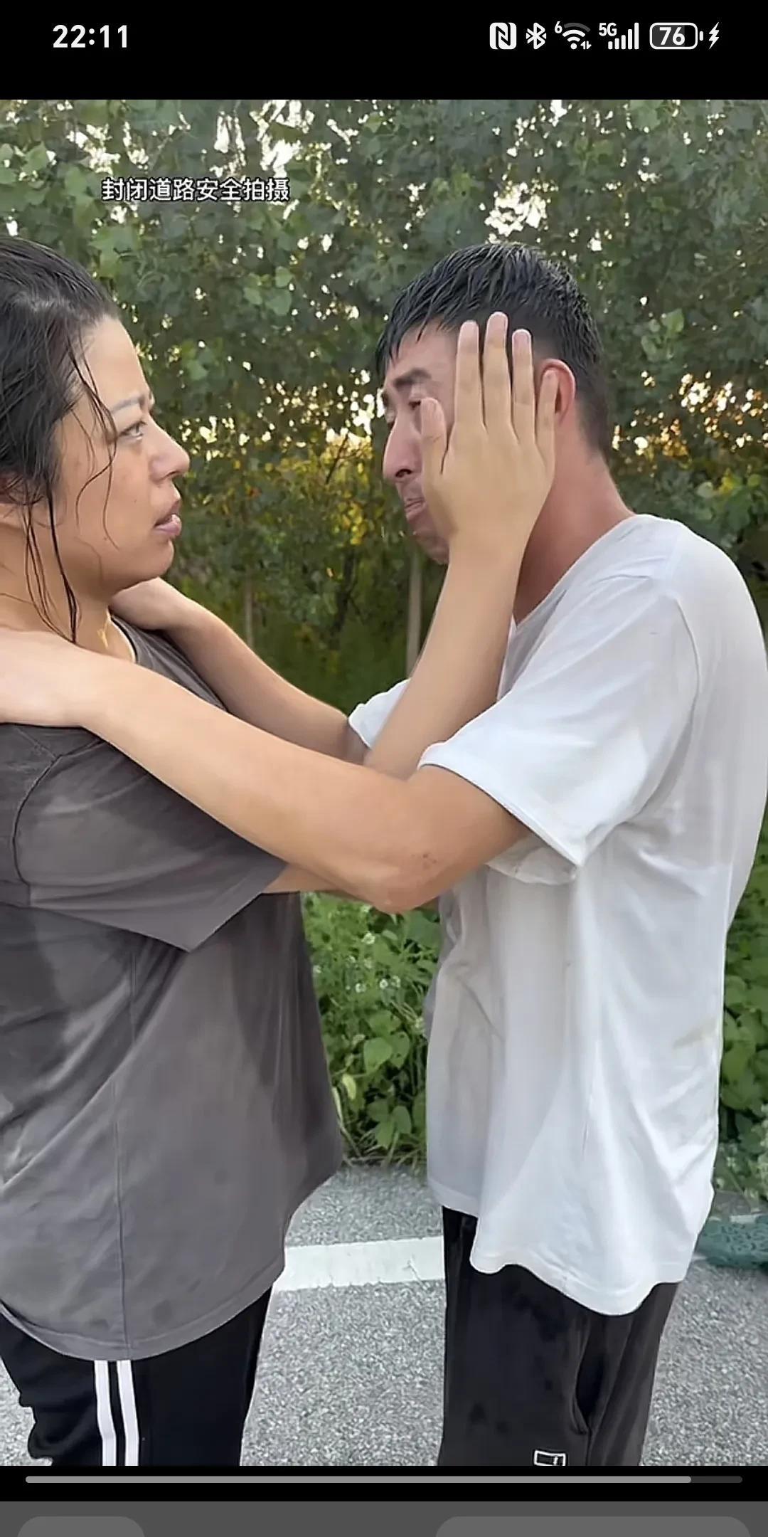 老婆为了让老公战胜病魔,早日恢复健康,冒着酷着,汗流浃背,两人光着脚走在烫脚的路