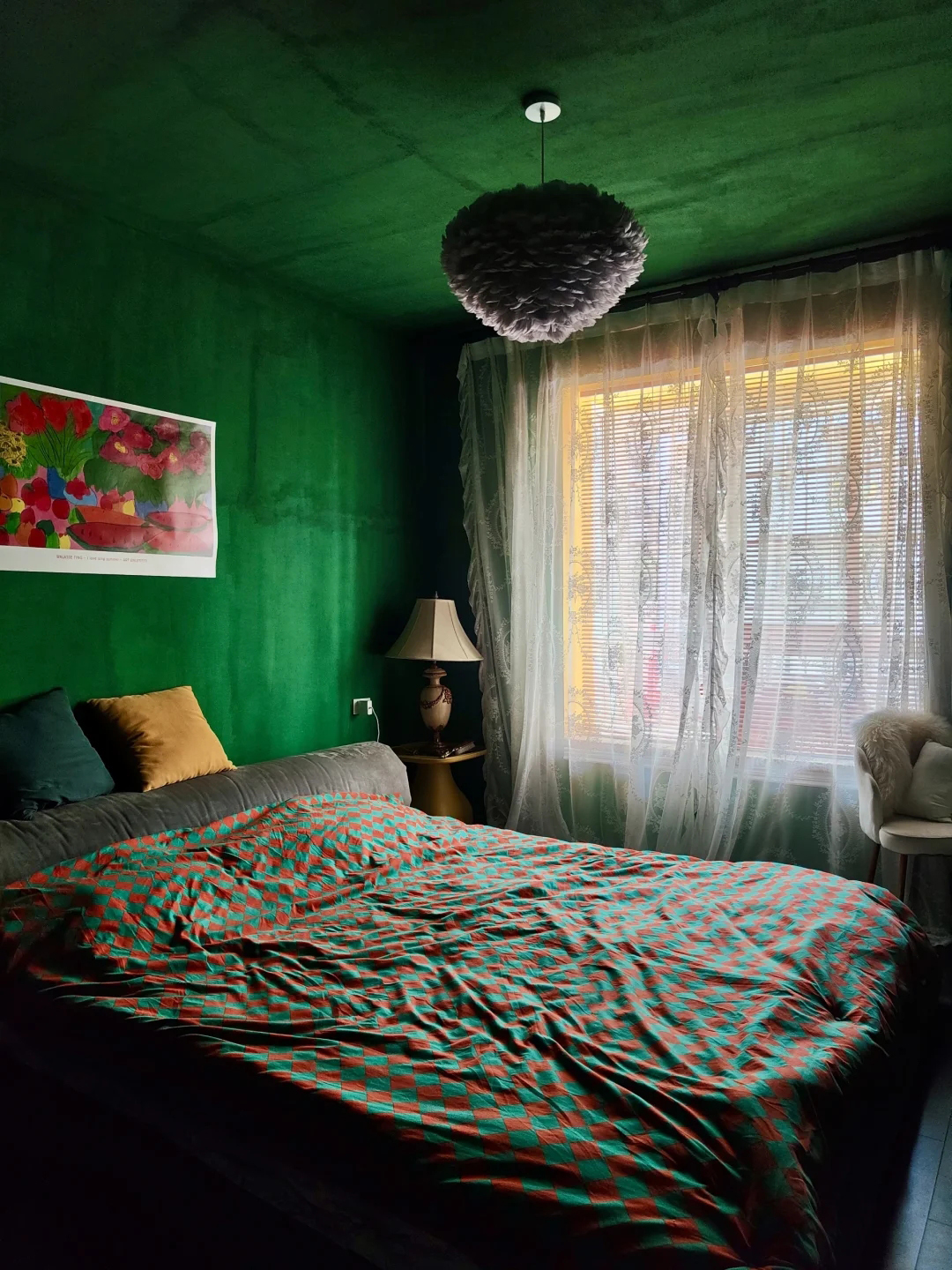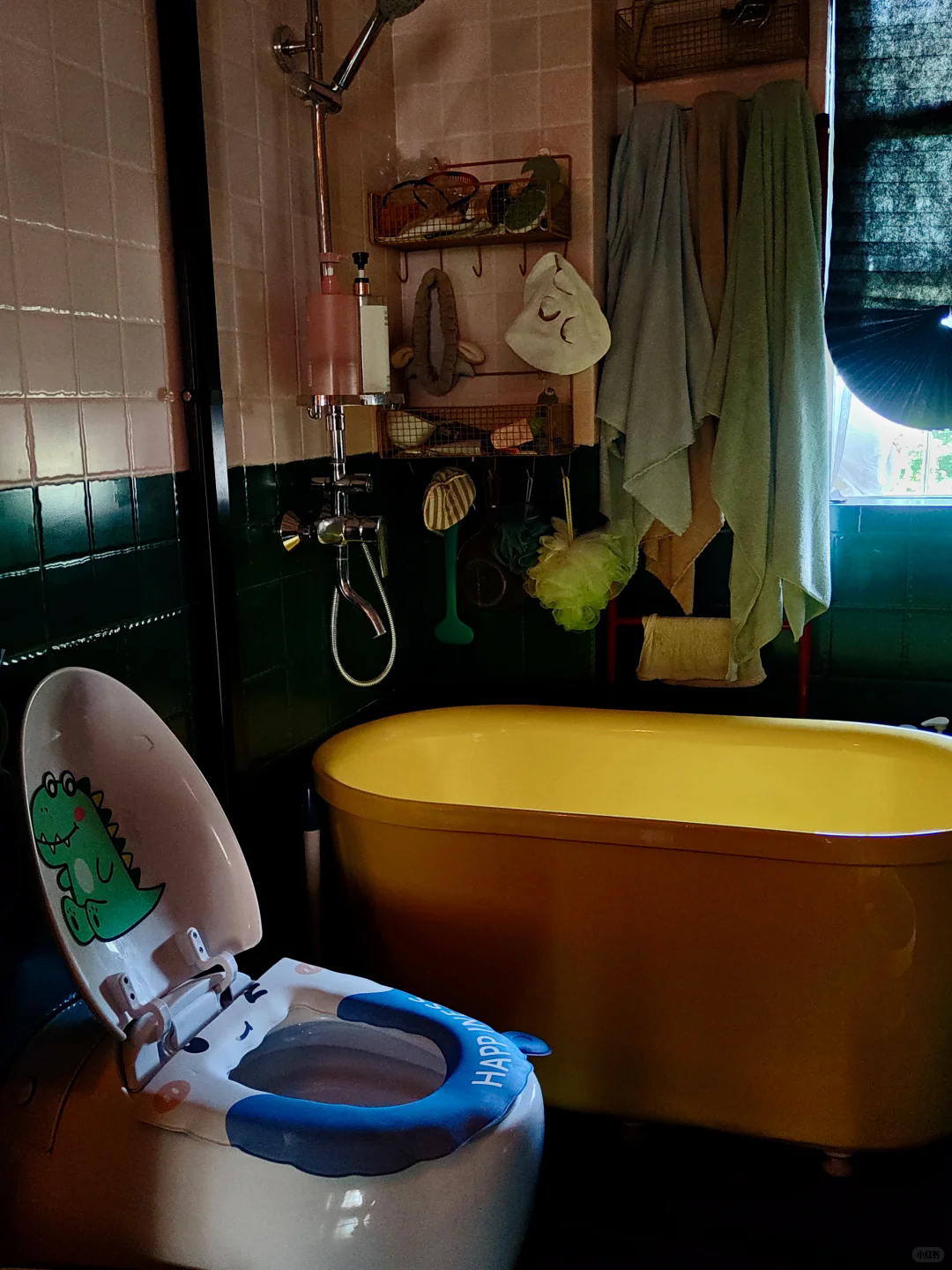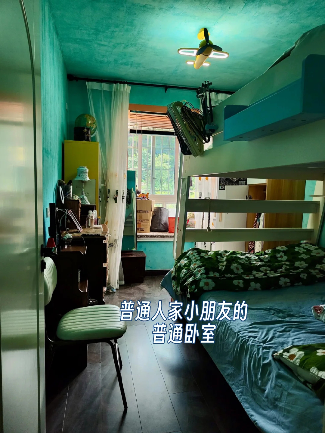 这个家装修也有点与众不同,客餐厅和厨房的地面铺设灰色瓷砖,墙面不造型,天花不吊顶,只刷一层水泥漆,而主卧、儿童房和卫生间则加入绿色调,营造出一种淡淡的复古气质。