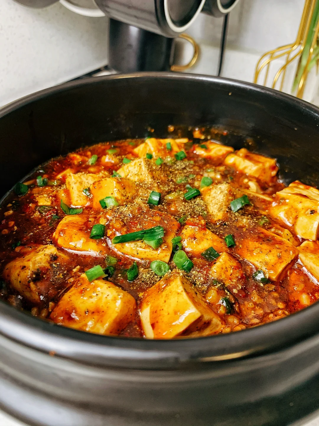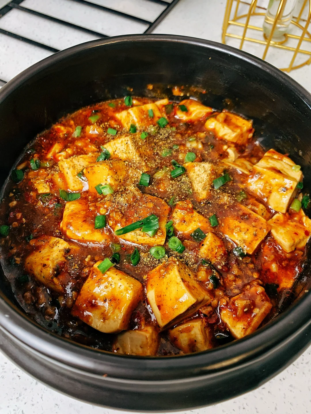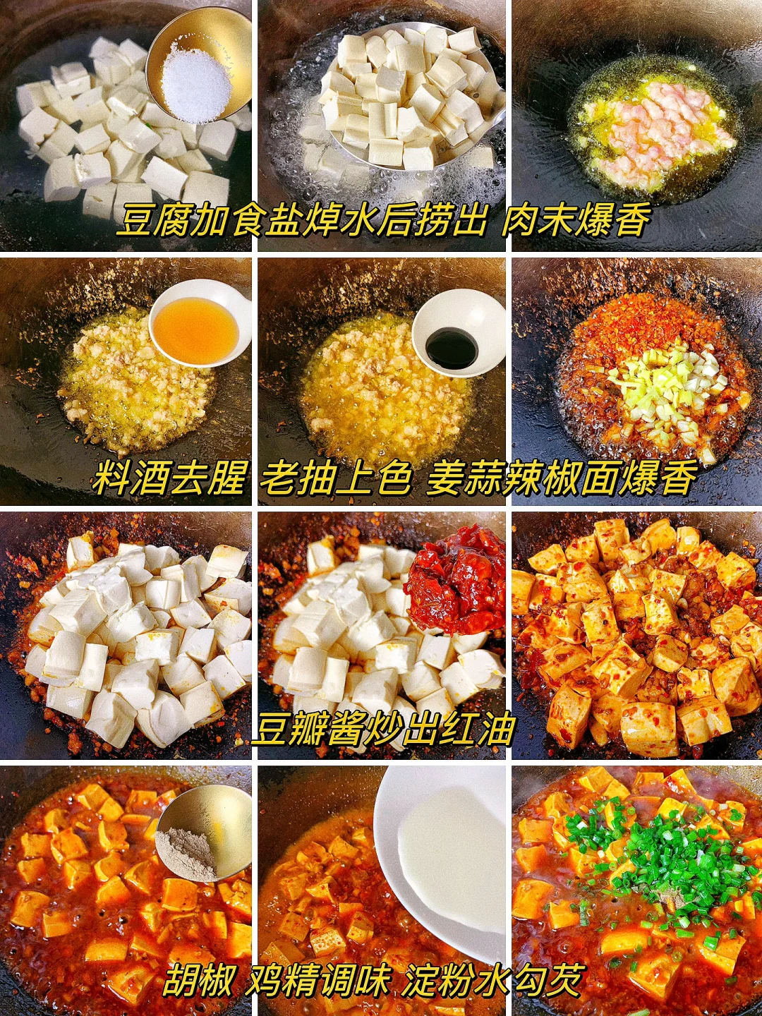 2⃣️肉末爆香加入料酒去腥,老抽上色,姜蒜辣椒面爆香后倒入豆腐,加郫县豆瓣酱炒出红油,一碗清水,少许食盐,黑胡椒鸡精调味,淀粉水勾芡,撒上葱花,最后撒上花椒面