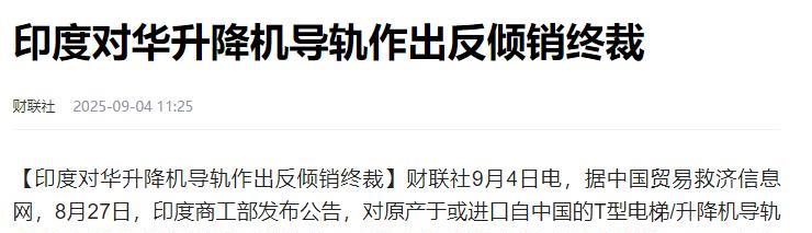 印度宣布了!9月4号,印度工商部突然宣布:要对从中国来的电梯导轨加税,最多加到一半多,而且一口气就要收五年。 这就是说,中国产品在印度卖价得涨不少,毕竟印度工商部这次可是动真格的。 要知道,电梯导轨这东西可不是小零件,是电梯上下运行的"腿脚",中国货在印度市场一直挺受欢迎,光2023年,咱们对印度出口的电梯导轨就涨了28.4%,像浙江Bonly这样的企业,光是今年前八个月就给印度发了好几批货,从T45到T89各种型号都有,现在这么一加税,原来卖100块的东西,现在最多得卖151块,印度买家要么多掏钱,要么就得找别家。 可印度为啥非得跟电梯导轨过不去?说穿了还是本土钢铁业喊疼喊得厉害,这两年印度钢进口量蹭蹭往上涨,2024到2025财年净进口了950万吨,创了九年新高,其中七成多都来自中国、韩国和日本。 印度钢铁协会一看这架势坐不住了,赶紧找政府哭诉,说进口货太便宜,把本土企业逼得快活不下去了。于是乎,贸易救济总局立马建议加税,美其名曰"保护国内产业",其实就是给本土钢铁企业,尤其是金达尔这样的巨头撑腰。 不过,这招也不是第一次用了,今年4月印度就对部分钢铁制品加了12%的临时关税,6月又对数字胶印印版下手,现在轮到电梯导轨,看来是把加税保产业当成固定套路了,有意思的是,他们加税还挺会挑,像不锈钢、电工钢这些高端货就豁免了,专盯着中端产品使劲,说白了就是既想要便宜的高端材料,又不想让本土中低端产业被挤垮。 但这波操作最尴尬的可能是印度自己的建筑商和电梯厂,之前依赖中国货图个物美价廉,现在税率一涨,成本肯定得转嫁到房价和物业费上,可本土企业又接不住这摊子,要是能接,印度也不至于连续两年成钢净进口国了,中国企业倒是有后路,像之前应对欧盟反倾销那样,去越南、墨西哥建个保税工厂,换个马甲接着卖,反正东南亚国家这几年电梯导轨配套企业增长得挺快,年均23.6%呢。 说到底,这还是中印贸易失衡闹的,中国一直是印度最大的贸易逆差来源国,印度看着心里不舒坦,就总想找点由头限制中国货,可话说回来,光靠加税也不是长久之计,印度喊着要在2030年实现3亿吨钢产量的目标,可真要实现这个,靠关起门来保护不如踏踏实实搞技术升级。,五年时间说长不长说短不短,要是本土企业光等着靠关税红利过日子,不琢磨怎么提升竞争力,到头来可能还是扶不起的阿斗。 而且,这种单方面加税的做法,说白了就是贸易保护主义的老套路,短期看确实能给本土企业喘口气,但长期来看,既坑了本国消费者,又扭曲了产业链,中国企业经历的贸易摩擦多了,早就练就了东方不亮西方亮的本事,东南亚、拉美市场都能开拓。 倒是印度得想想,老是这么临时抱佛脚式地加税,最后会不会把自己的市场信誉给加没了?做生意讲究的是公平竞争,靠关税壁垒砌墙,砌得再高也挡不住全球产业链的规律。