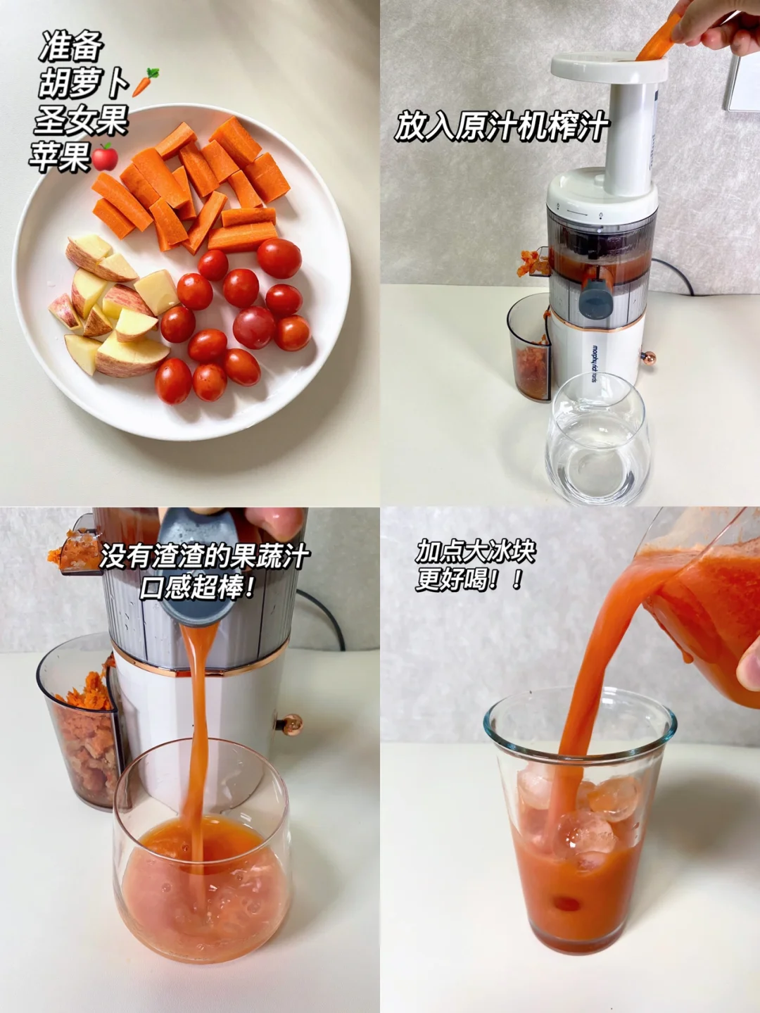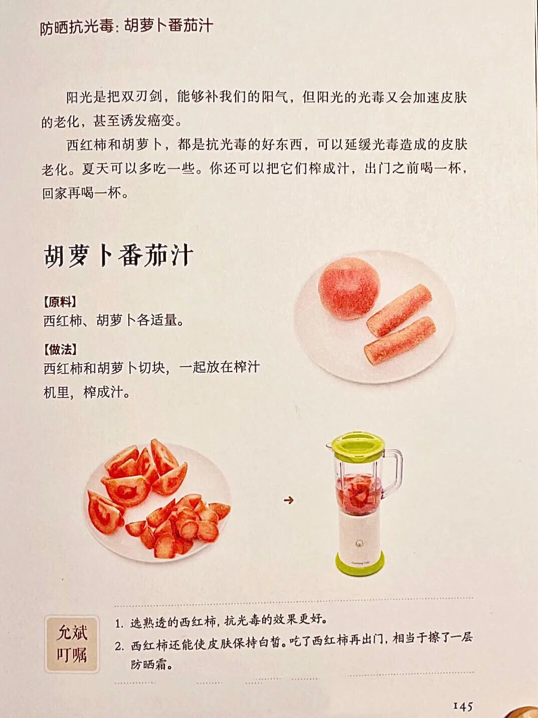 所有女生一定要喝这杯! 白就算了!怎么还发光呢!! 喝番茄汁可以防晒哦,德国和荷兰两国科学家做的研究表明,如果每个人每天食用40克番茄,被太阳晒伤的风险将减少40% 美白的同时还能抵御紫外线!! 📝食材:🍅小番茄➕🥕胡萝卜➕🍎苹果 👉做法:切块全部放入原汁机榨汁,加入适量冰块🧊,超级适合夏天喝! 真的VC满满的一杯!美白又防晒! 每天出门前来一杯,姐妹一定要喝呀!!