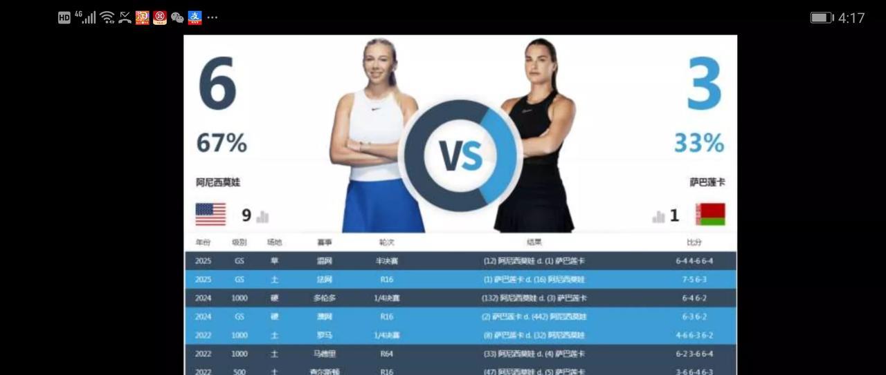 从去年美网到今年美网连续5个大满贯女单决赛,都有美国人。 去年美网萨巴伦卡与佩古拉,萨巴伦卡胜 今年澳网凯斯与萨巴伦卡,凯斯胜 法网高芙与萨巴伦卡,高芙胜 温网斯瓦泰克与阿尼西莫娃,斯瓦泰克胜 上面4个决赛,美国人2胜2负。 美网阿尼西莫娃与萨巴伦卡,谁胜? 阿尼西莫娃与萨巴伦卡共交手9次,阿尼西莫娃6胜3负。 今年,两人交手2次。 法网第四轮,萨巴伦卡胜 温网半决赛,阿尼西莫娃胜。 期待比赛。 希望阿尼西莫娃获胜。