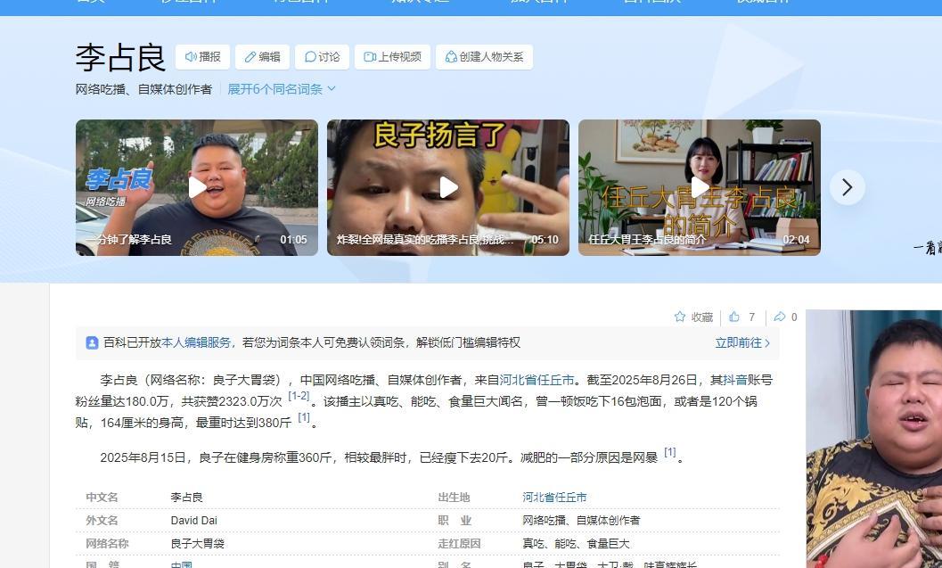 一顿吃16包泡面,或者37根油条,或者120个锅贴,体重近400斤,拥有350万粉丝,一天最高能挣2万块,年收入高达300多万,这就是沧州网红吃播,大胃袋良子。 良子,真名叫李占良,打小儿,日子就不算宽裕,他书没念多少,传闻小学没毕业就辍学了。 长大后良子啥活都干过,搬运工、饭店后厨切菜,那会儿的良子,日子过得紧巴巴,靠力气吃饭,累是累,但也踏实。 后来短视频平台火了,普通人突然有了露脸的机会,良子也赶了这波潮流,起初他没想着吃播,而是搞起了徒步直播,自称“中国徒步第一胖”。 良子拖着沉重的身子,走在路上,镜头里全是汗水和喘气,有人觉得这胖子有毅力,有人纯粹看个新鲜,正是这份好奇给他攒下了第一波流量。 从徒步到吃播,良子转得顺理成章,那时候吃播正火,谁吃得多、吃得夸张,谁就能抓住眼球。 良子抓住了这机会,镜头前大口吞泡面、啃油条、吃锅贴,吃相不讲究,但就是有种让人挪不开眼的冲击力。 观众看得目瞪口呆,弹幕刷得飞起,慢慢地,良子从一个默默无闻的胖子,变成了几百万粉丝的大胃袋良子。 可这名气代价不小,良子的体重,最重的时候快400斤,胃撑得吓人,医生说堪比三个成年人的容量。 良子血糖高得离谱,血压也早超标了,直播时,他埋头猛吃,汗水淌下来,蜇得眼睛都睁不开,只能甩甩头继续。 观众喊“再吃点”,良子就真再吃点,有人说这是粉丝期待,有人说这是流量绑架了他。 良子不是没想过停下来,他试过减肥,也说过想活得健康点,可没坚持多久,又被镜头前的食物拉回去。 为啥停不了?因为停下来,流量就没了,收入就没了,好不容易爬上的位置,也就没了,在这个流量为王的时代,良子像被推上了一辆刹不住的车,明知方向不对,也没法停。 回看良子的路,从搬运工到网红,每一步都在试着改变命,早年干体力活,可能是想多攒点钱,过上好日子。 后来搞自媒体,想抓住机会,摆脱底层的苦,可真站上流量高地,良子却被困住了,吃播给了他收入,也给了他一身病痛。 网友的关注,有支持,有猎奇,也有冷眼等着看他咋“收场”,这关注像把刀,给了他舞台,也给了他枷锁。 良子的故事,其实是很多底层网红的写照,他们拼了命想翻身,却往往被流量绑住,付出了想不到的代价。 有人说良子自找的,明知暴食伤身体,还往里冲,可换个角度,他何尝不是被时代推着走?短视频时代,普通人想出头,太难了。 良子用身体换来了粉丝和收入,却也把自己推到了健康的悬崖边。 信息来源:百度百科 李占良