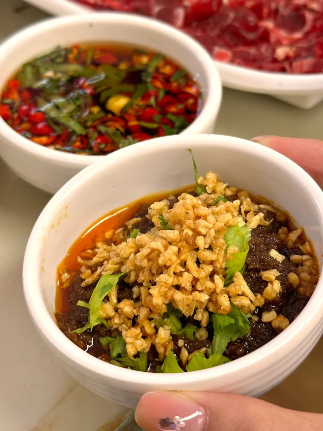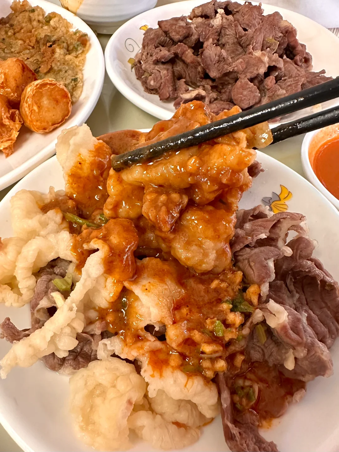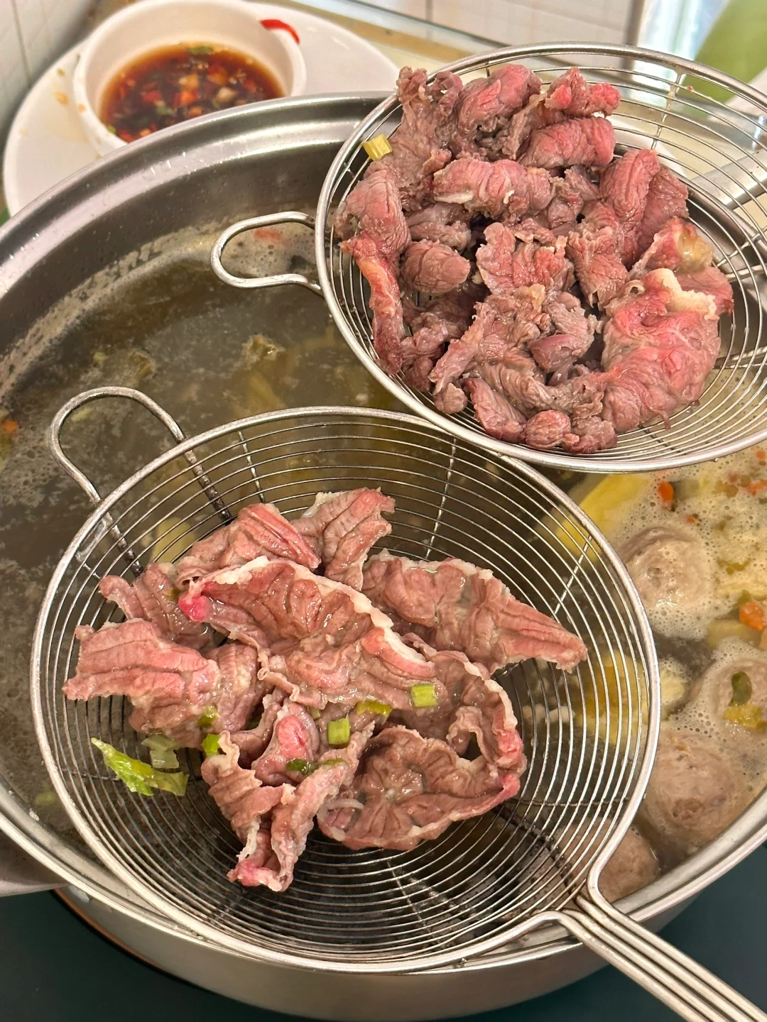 酸菜凉瓜汤底好特别,涮肉吃配上沙茶酱和金蒜,又香又鲜又嫩!!一定要点五花腱和胸口油 一口肉香充斥整个嘴巴 我很喜欢!